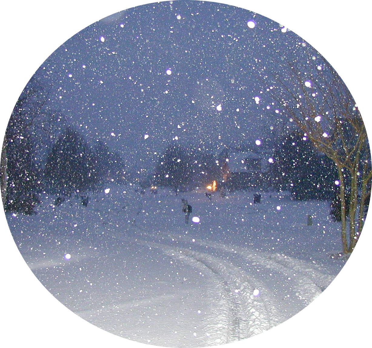 A couple of years ago, it began to snow one day while Motor Man and I were at our shop. When we got home, I stood inside our garage and took this picture, facing the street. It’s the full-size version of the photo on the sidebar of my blog. Right over there ————————————————————————->>>