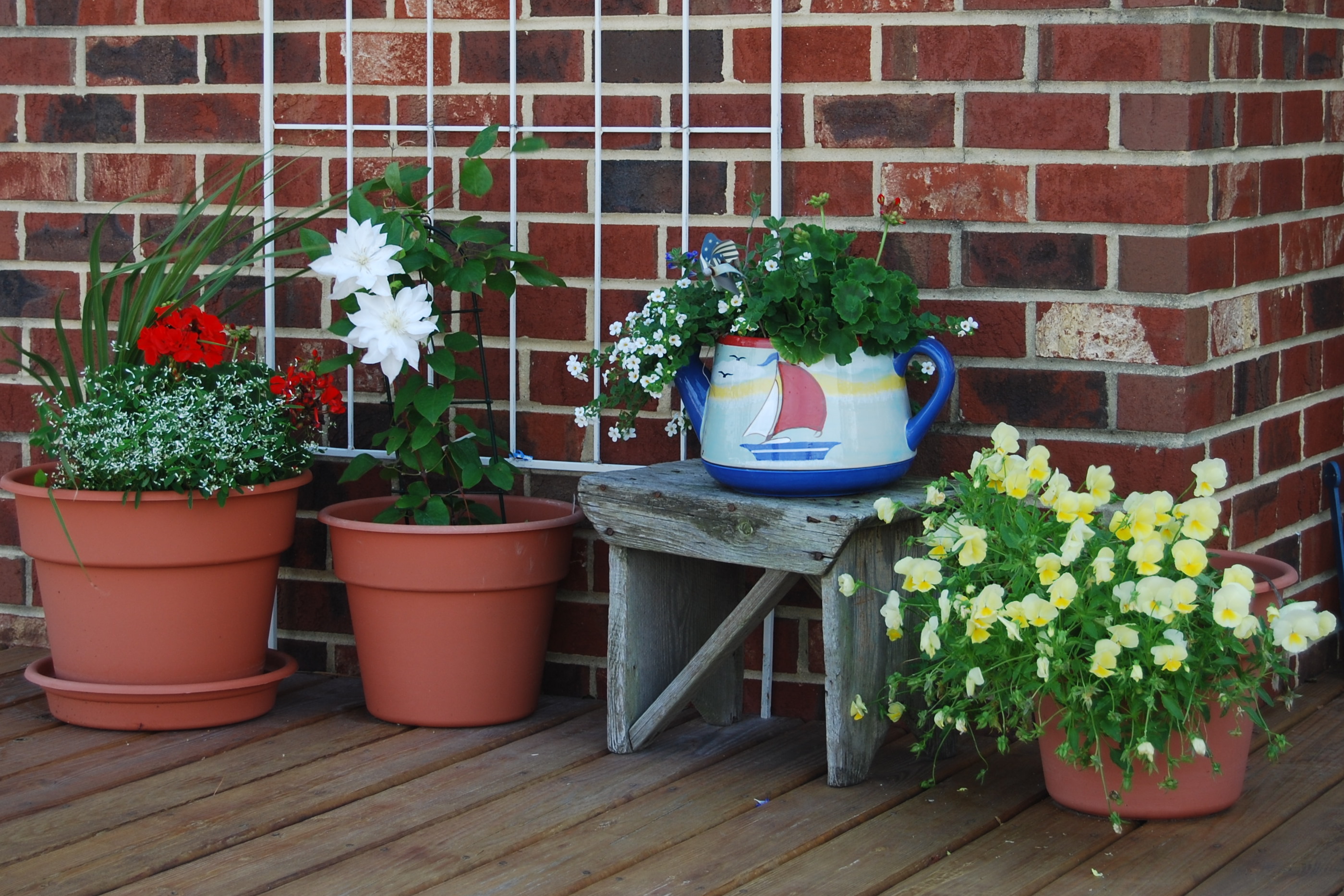 Things were apparently going well in my flower-world when I took this photo of the flowers on our deck. The large white flower is a clematis. The other flowers are white bacopa, yellow pansies and red geraniums with white “Diamond Frost”.