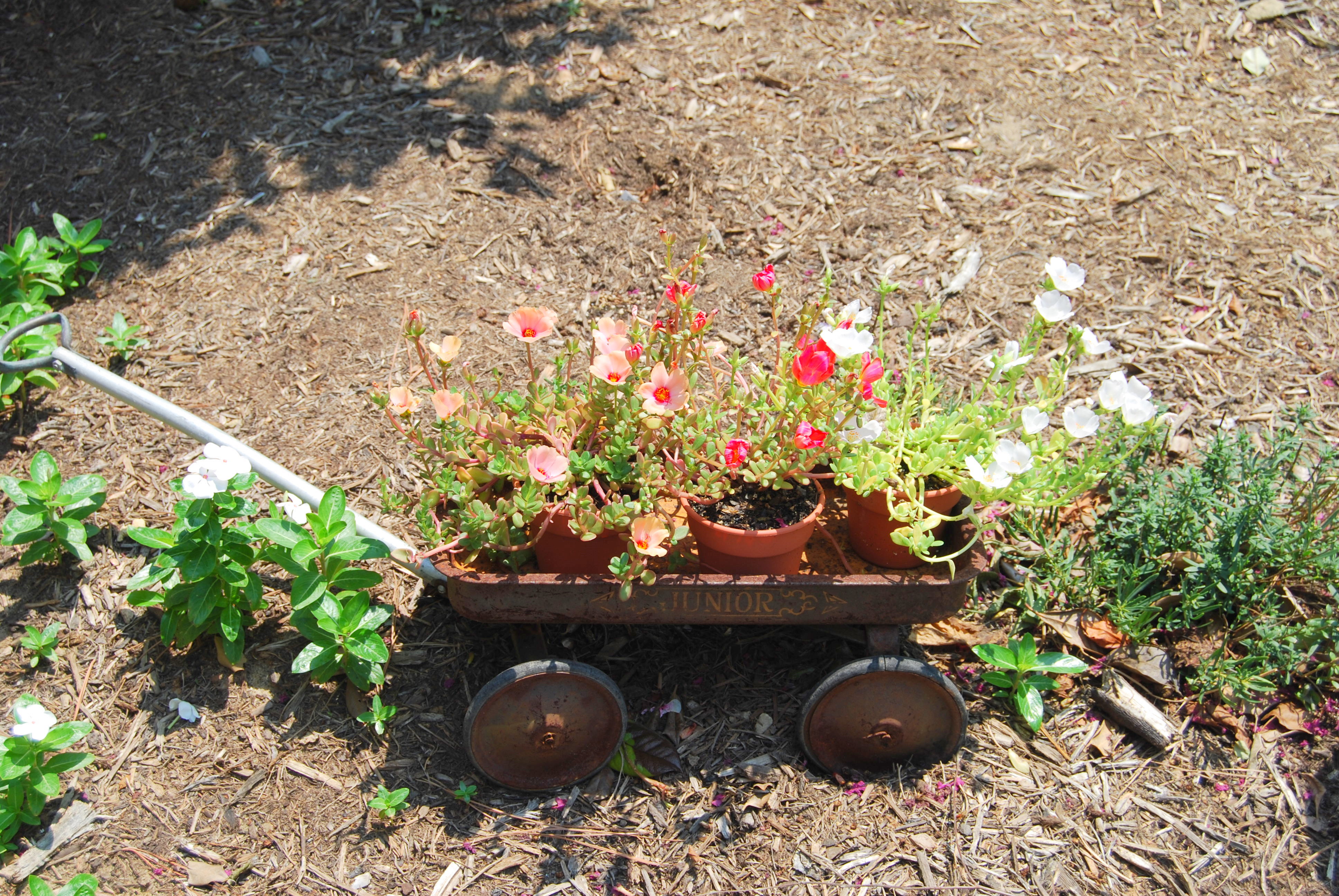 Portulaca is a favorite of mine. It’s so hardy – it loves hot, dry weather. So it did particularly well last summer. I found this little wagon at an antique shop, and had to buy it, since it has the word “Junior” on the side. (That’s Motor Man’s everyday nickname.)