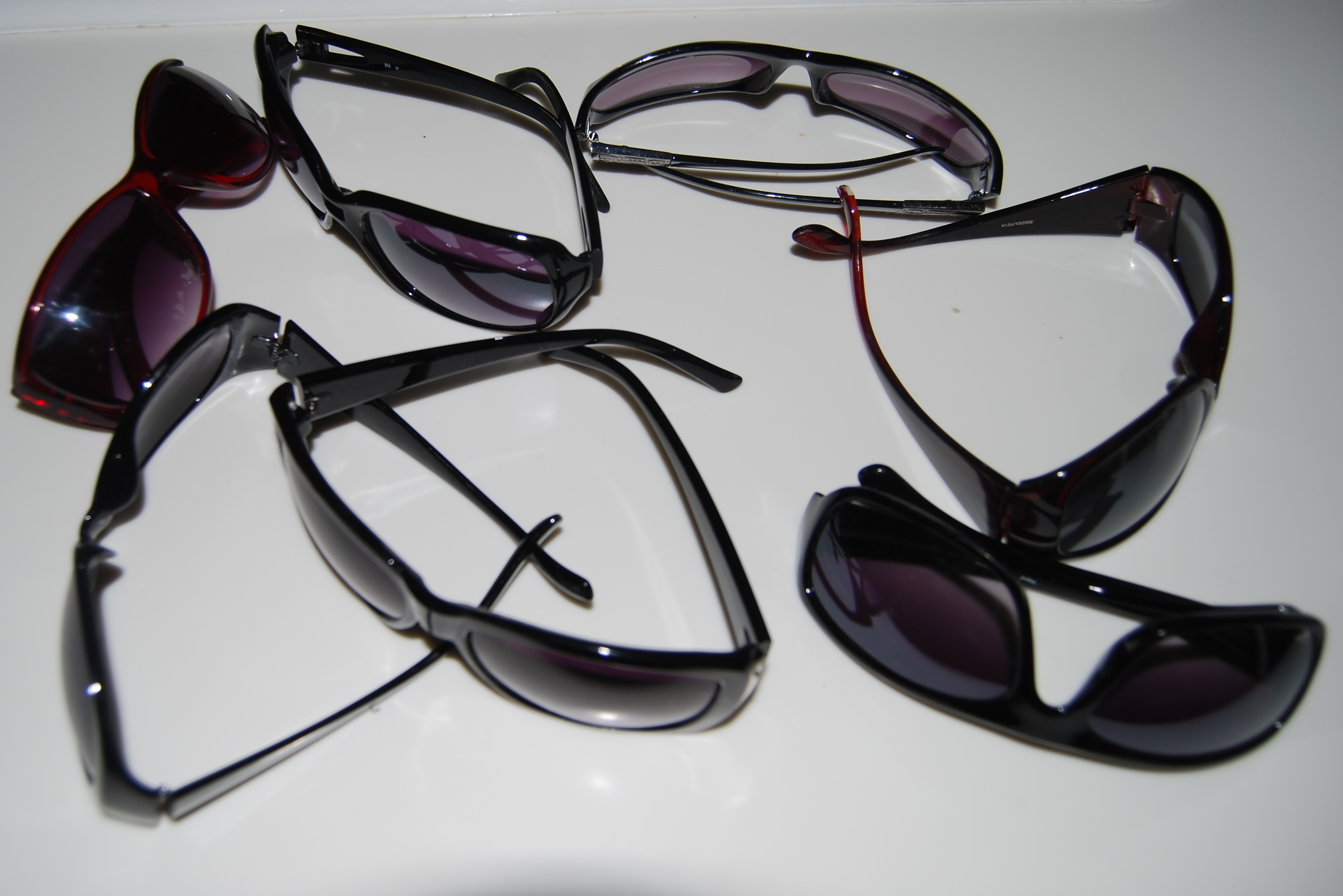 No less than seven pair of sunglasses, with varying degrees of scratches. This didn’t include the pair in the sunglass holder above the rearview mirror, or the pair in my purse, or the two pair in Motor Man’s pick-up.