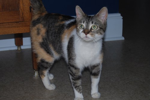 She’s three years old and is described as a dilute calico.  A dilute calico has three colors with white being the dominant color.  I think she has some Maine Coon cat genes too. There’s evidence of the “M” on her forehead. Did you know that if a cat has more than two colors, it’s most likely a female?