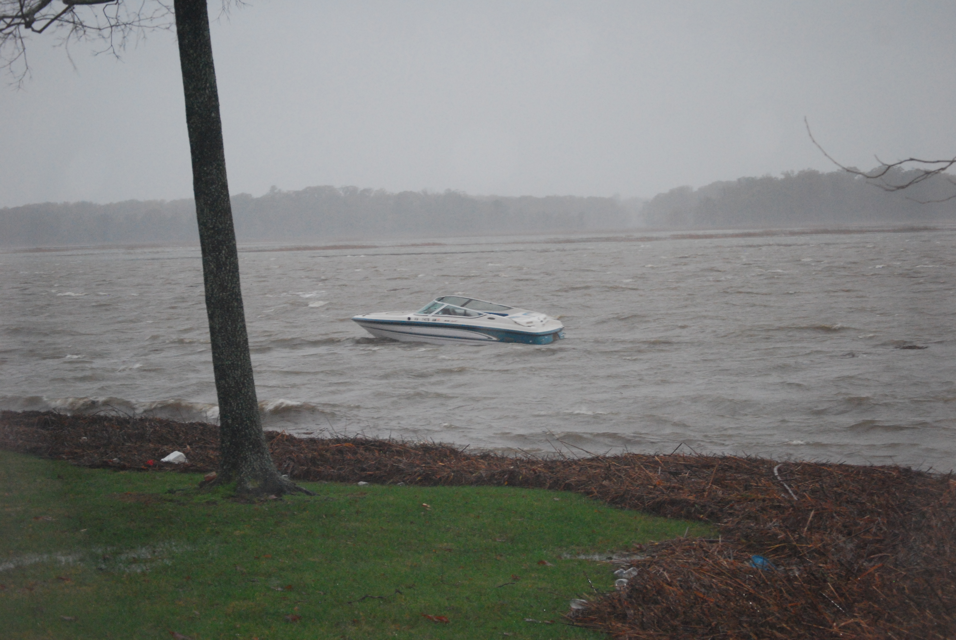 There’s no one piloting that boat. It was in the midst of a violent northeaster, and the boat had floated across a larger river and up into the smaller one that flows by our house. Unbelievably this boat didn’t crash into anything, and the owner later recovered it – undamaged.