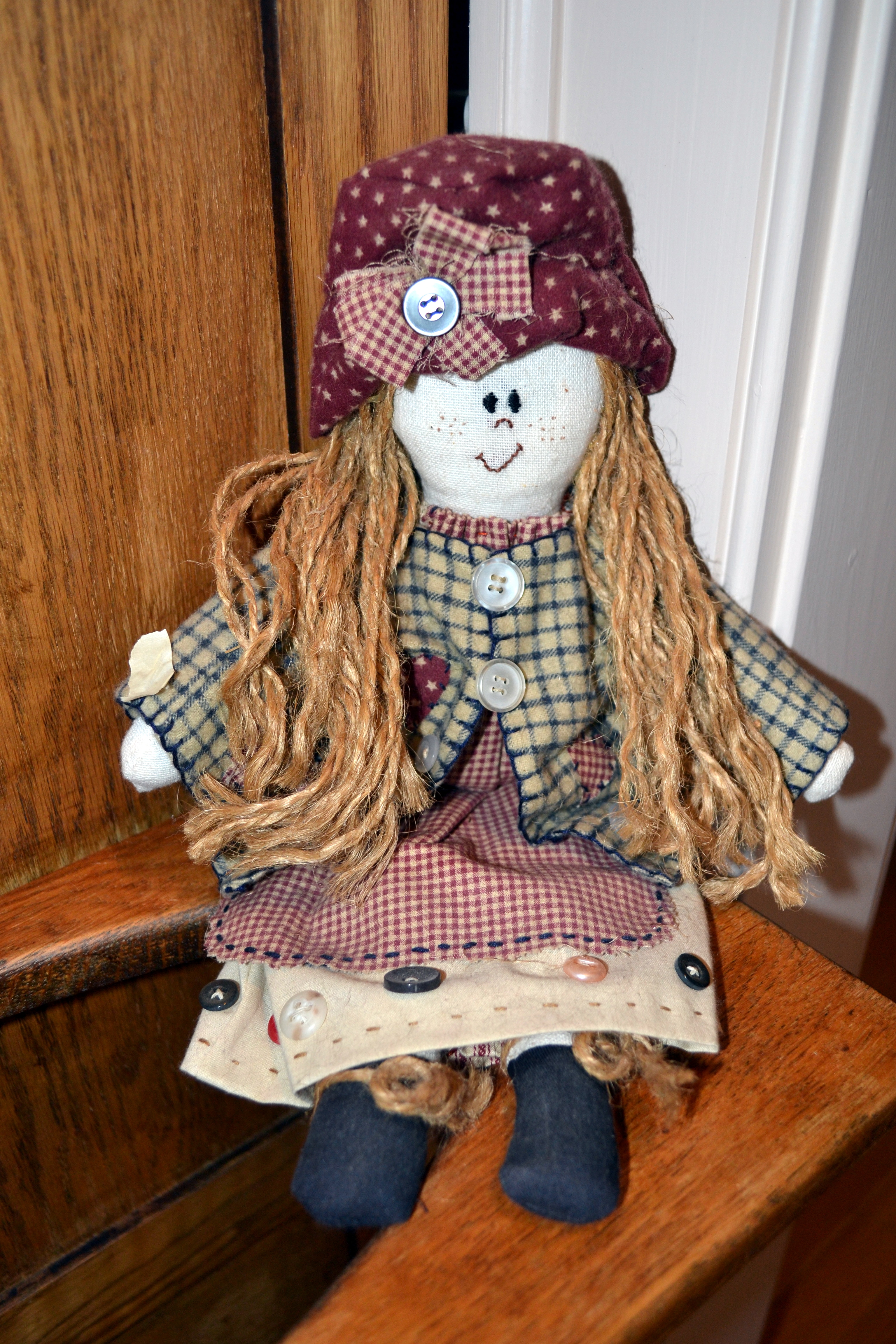 This little doll has hair made of jute, an embroidered face (complete with freckles), and button accents on her dress. And I think the little bow with the button just “makes” her hat.