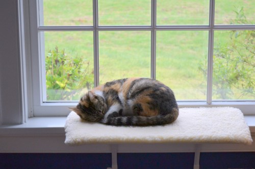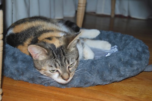 She’s settling in really well. After a couple of weeks of totally ignoring it, and sleeping instead on the cold, bare floor, she’s accepted her kitty bed (under our bed.)