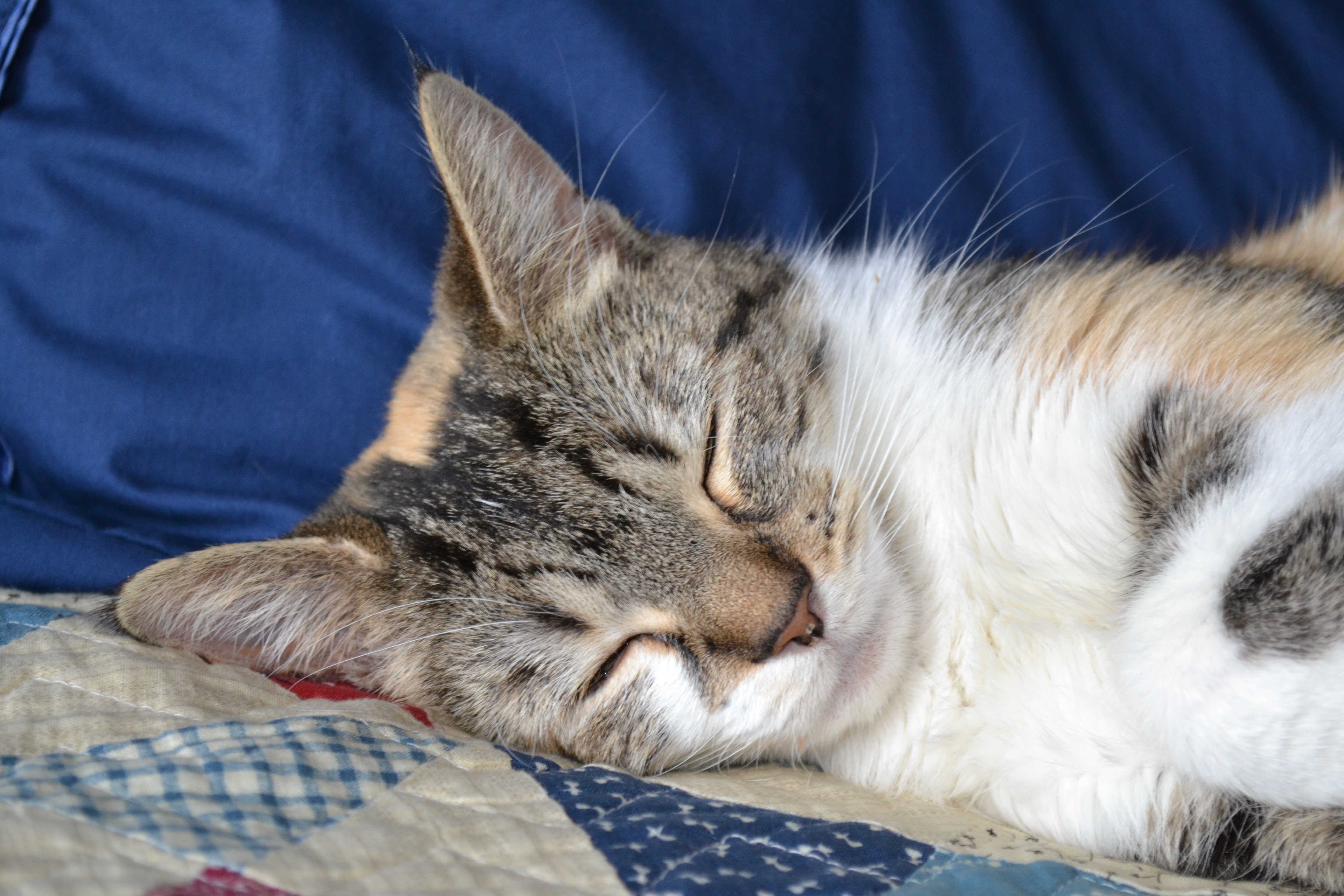 But sometimes, she likes to sleep ON our bed. By the way, did you know that the little pink spot on a kitty’s nose is referred to as “nose leather”? Sundae’s is pink, but on some cats, it’s black.