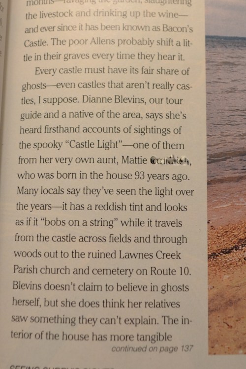 The folks at Chesapeake Bay Magazine had plans to write an article about Bacon’s Castle and came for a tour to obtain information.  And I happened to be the guide who gave them the tour. They discovered that my mother and her family lived in the house in the 1920’s and 1930’s. That led to questions about my family’s knowledge of the ghost light. After the tour,  they took pictures of me in the garden.
