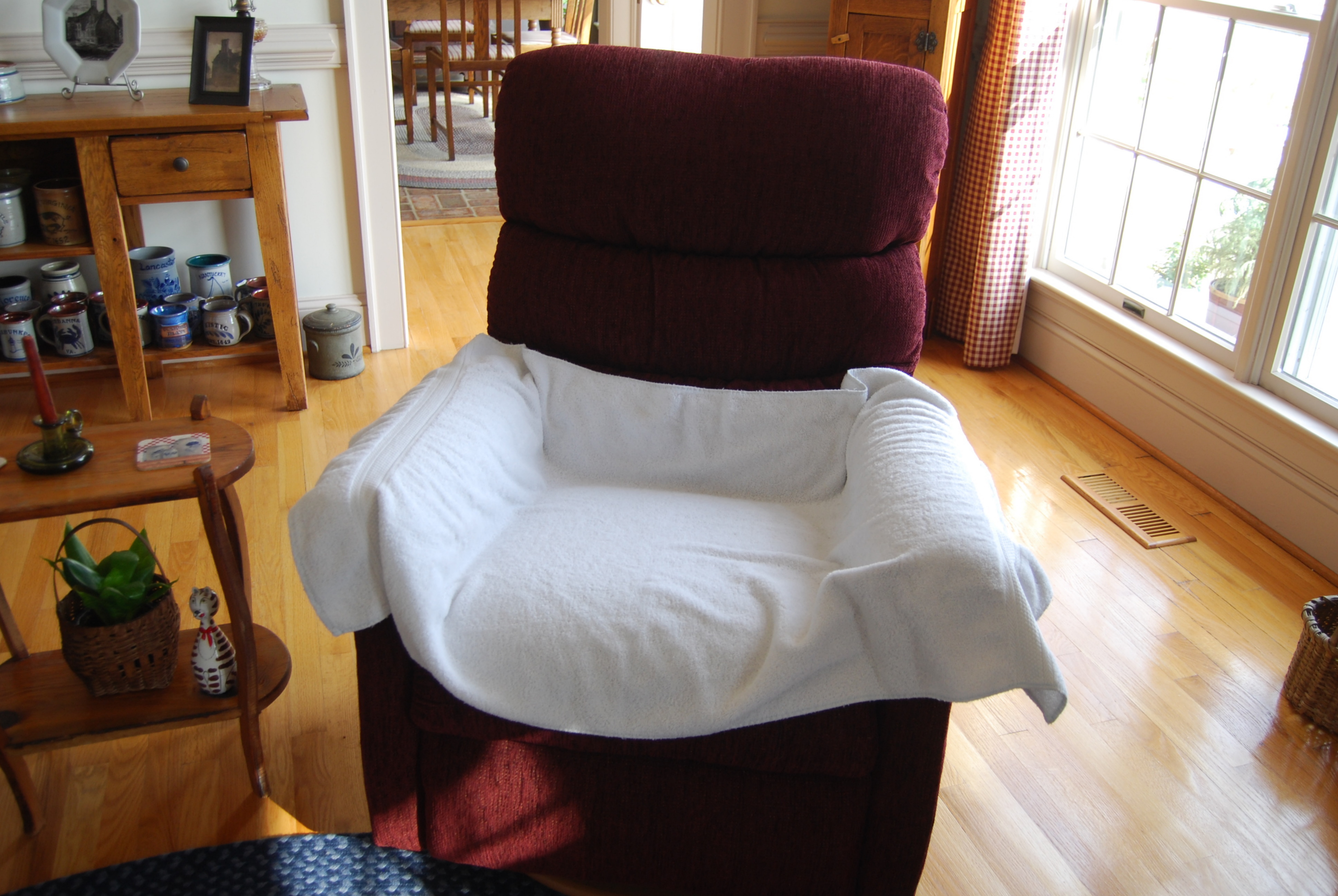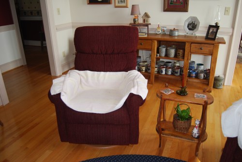 So sweet little Sundae began sleeping on this recliner, located beside the first one. The mean lady vacuumed all the kitty fur off the chair, and put a towel over it to protect it.
