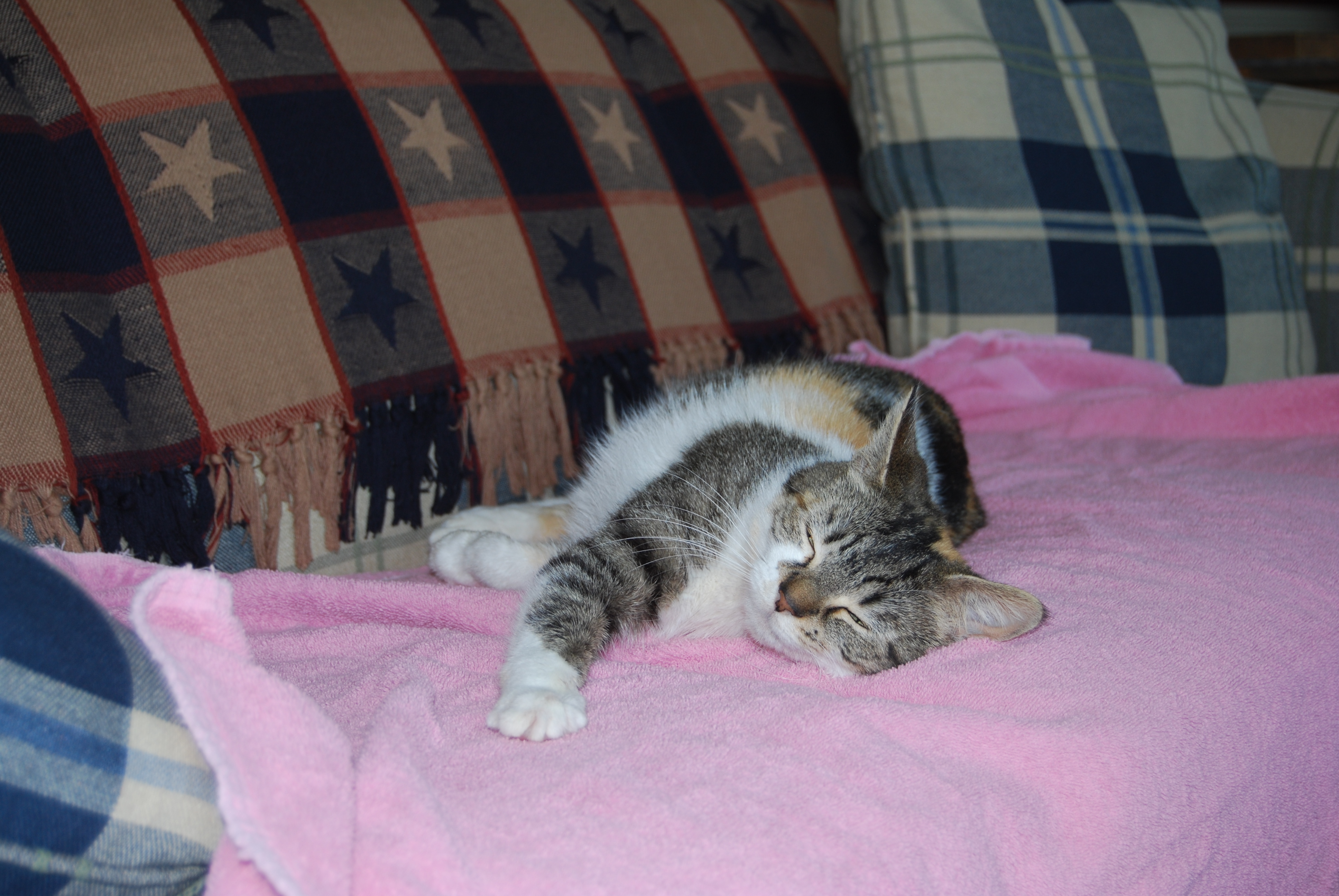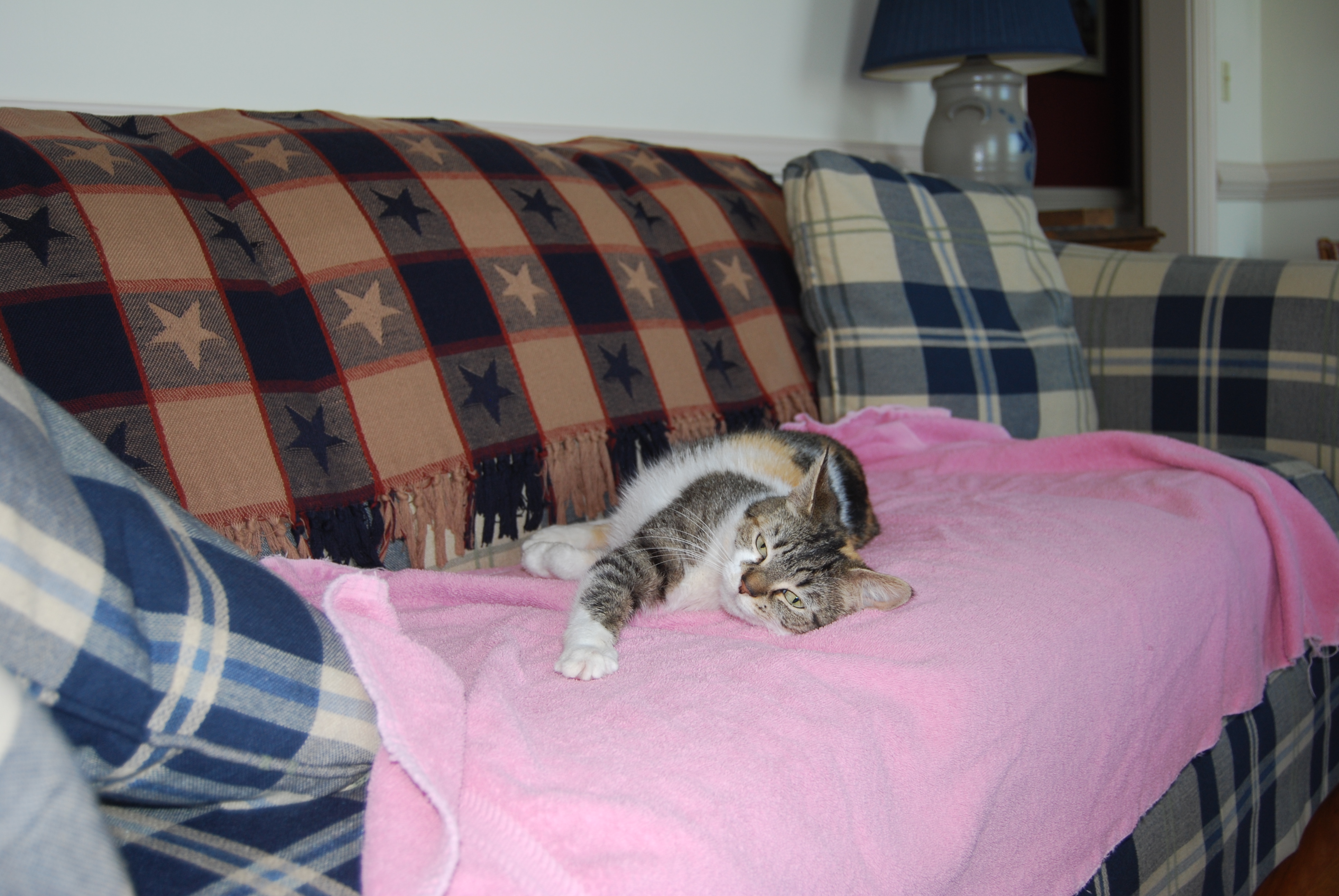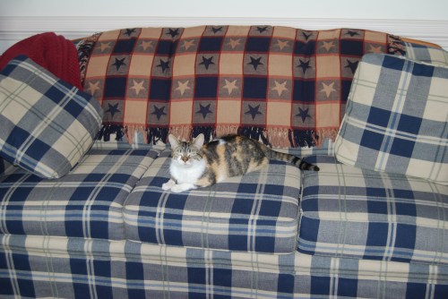 The mean lady vacuumed all the kitty fur off the sofa and put a towel on it too. But, alas, sweet little Sundae had run out of living room furniture and had to give in to the mean lady’s wishes and sleep on the towel.