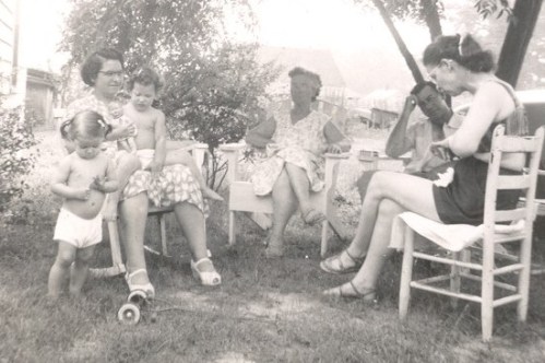 My brother, Stanley and his family came to visit from their home Pennsylvania, as they do each year around this time. Betty, his wife, took this picture of us out in the yard. That’s me on the left with my little girl, Dianna, on my lap. Mama’s sitting next to me, Stanley is to her left and my sister, Lucille is to his left. The little girl standing beside me is Stanley’s daughter, Christine. They always seem to visit during the hottest part of the summer.