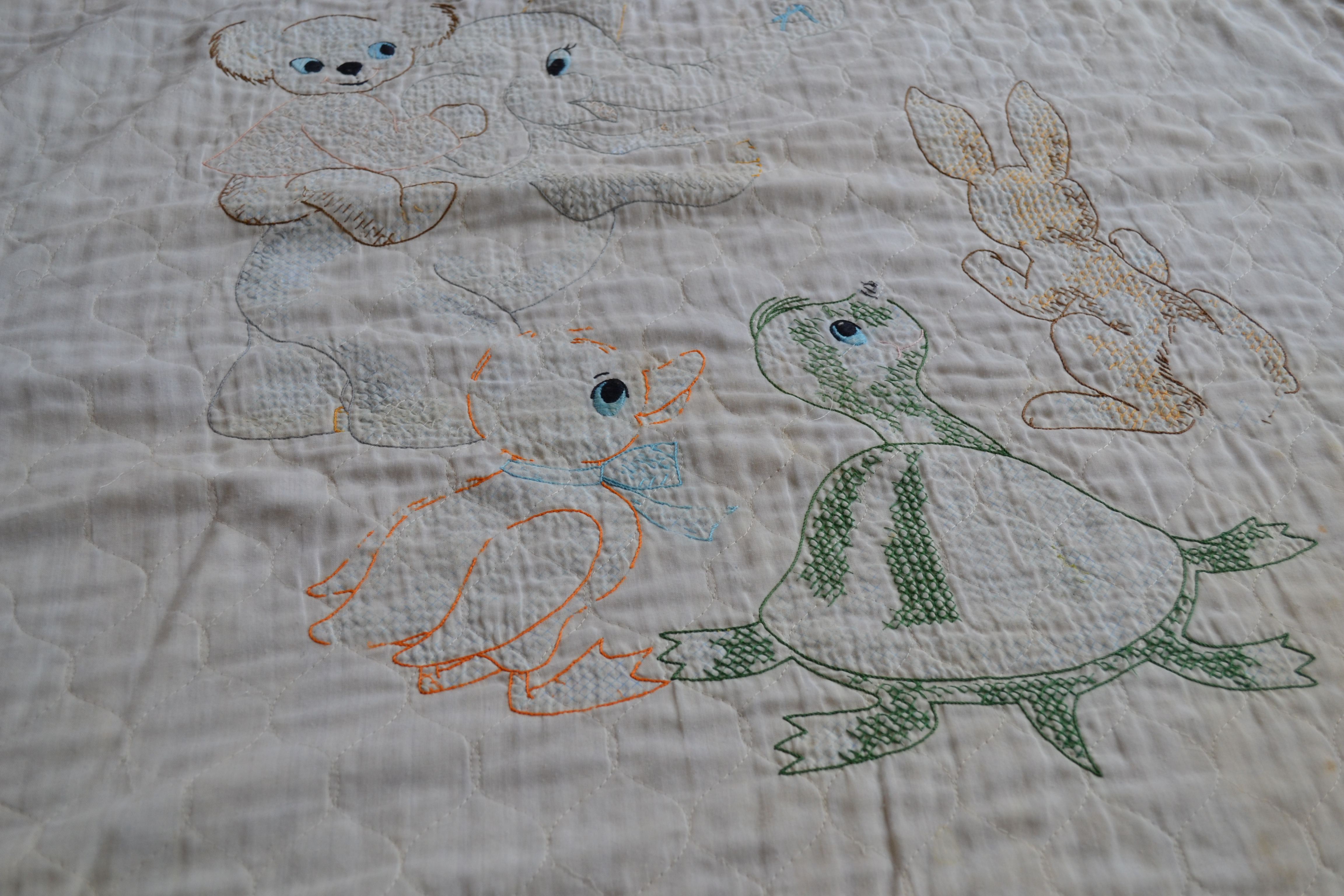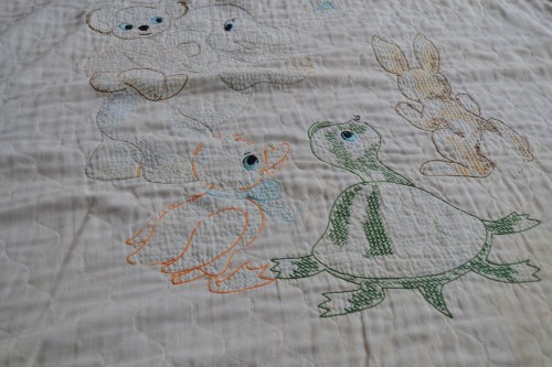 For my son, Marshall, it was an embroidered baby quilt that had been a baby shower gift from my cousin, Lona and her mom. It was one of those lightweight quilts that came “stamped” with the design. And Lona and her mom embroidered it. I treasured the quilt from the beginning,  and I was happy that it became the item Marshall always wanted to have with him.