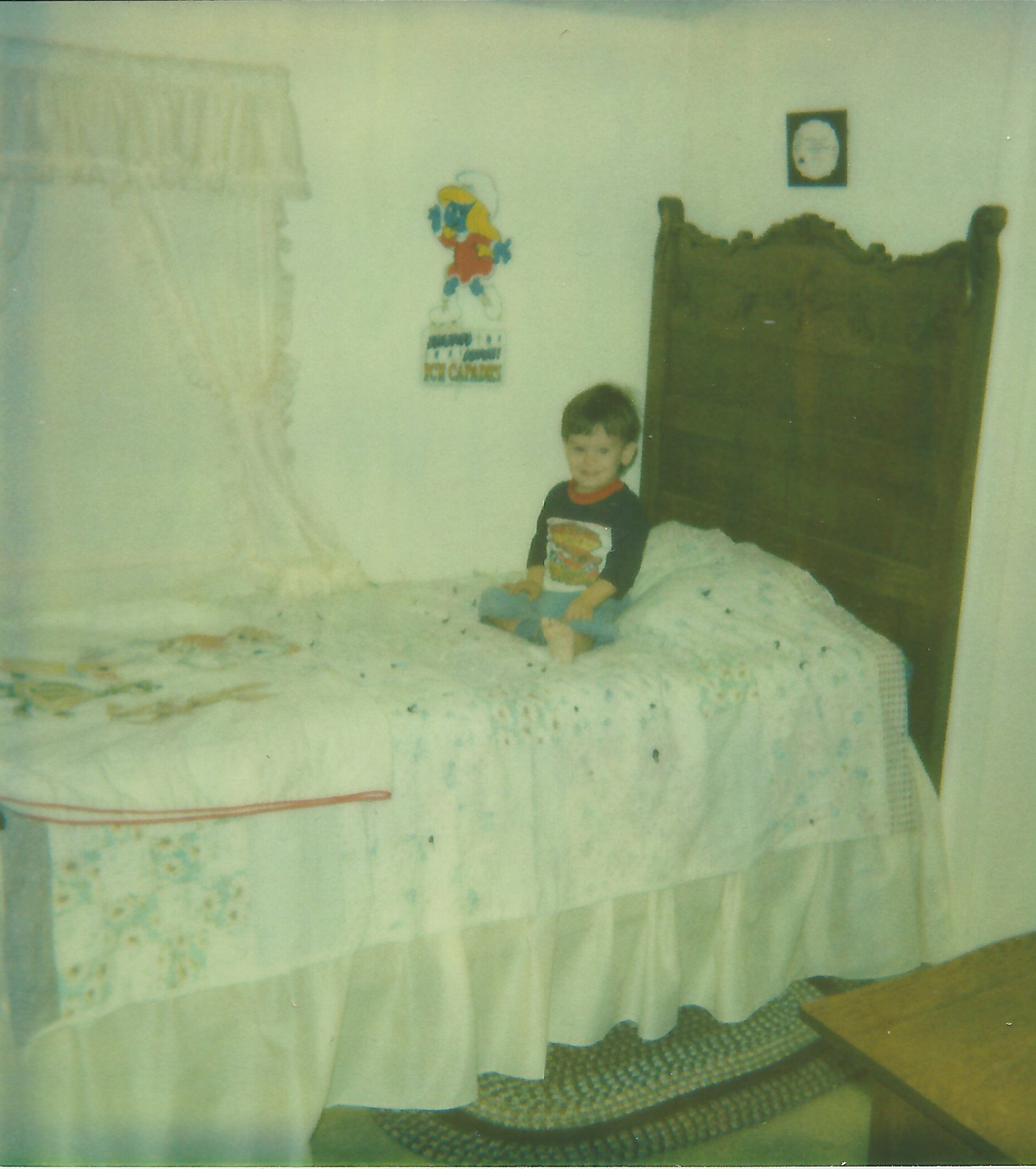 By the time Marshall graduated from his crib to a big boy bed, his “banket” was an ever-constant companion. Here it is at the foot of his bed. I can’t believe how tiny he is. (I apologize for the poor photo quality. It was a Polaroid and hasn’t stood the test of time well.)