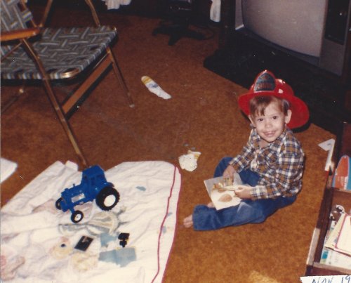 Around this time, Marshall must have been undecided as to whether his future was in firefighting or farming.  But there’s his blanket, serving as a field for the tractor.