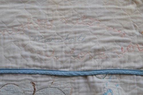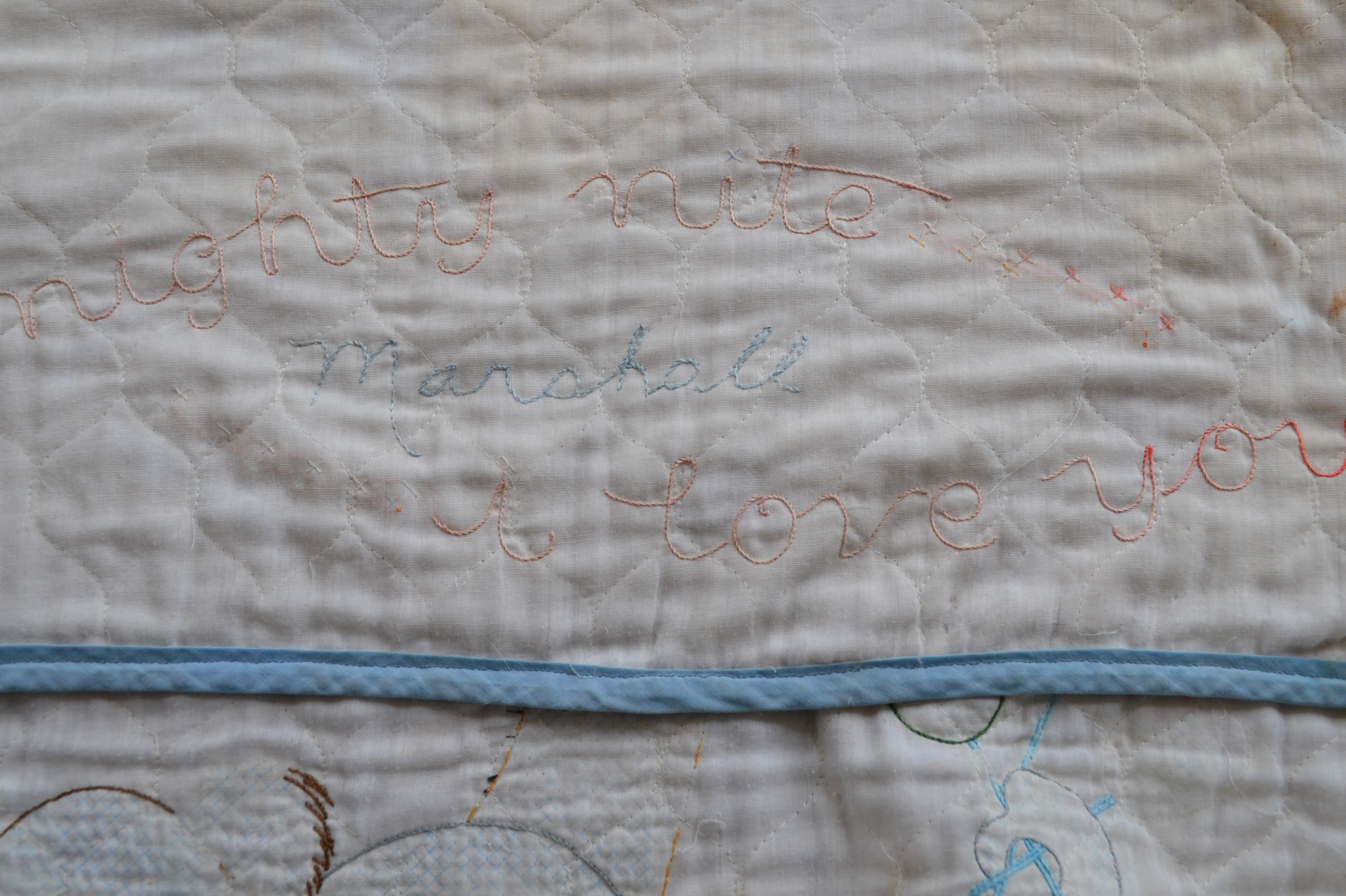 During the time Marshall was carrying this blanket EVERYWHERE, the red binding wore away, and I replaced it with blue.  The “nighty nite” and “I love you” were printed on the quilt, with the space left blank in the middle for the baby’s name. I embroidered “Marshall” in that space after he was born.