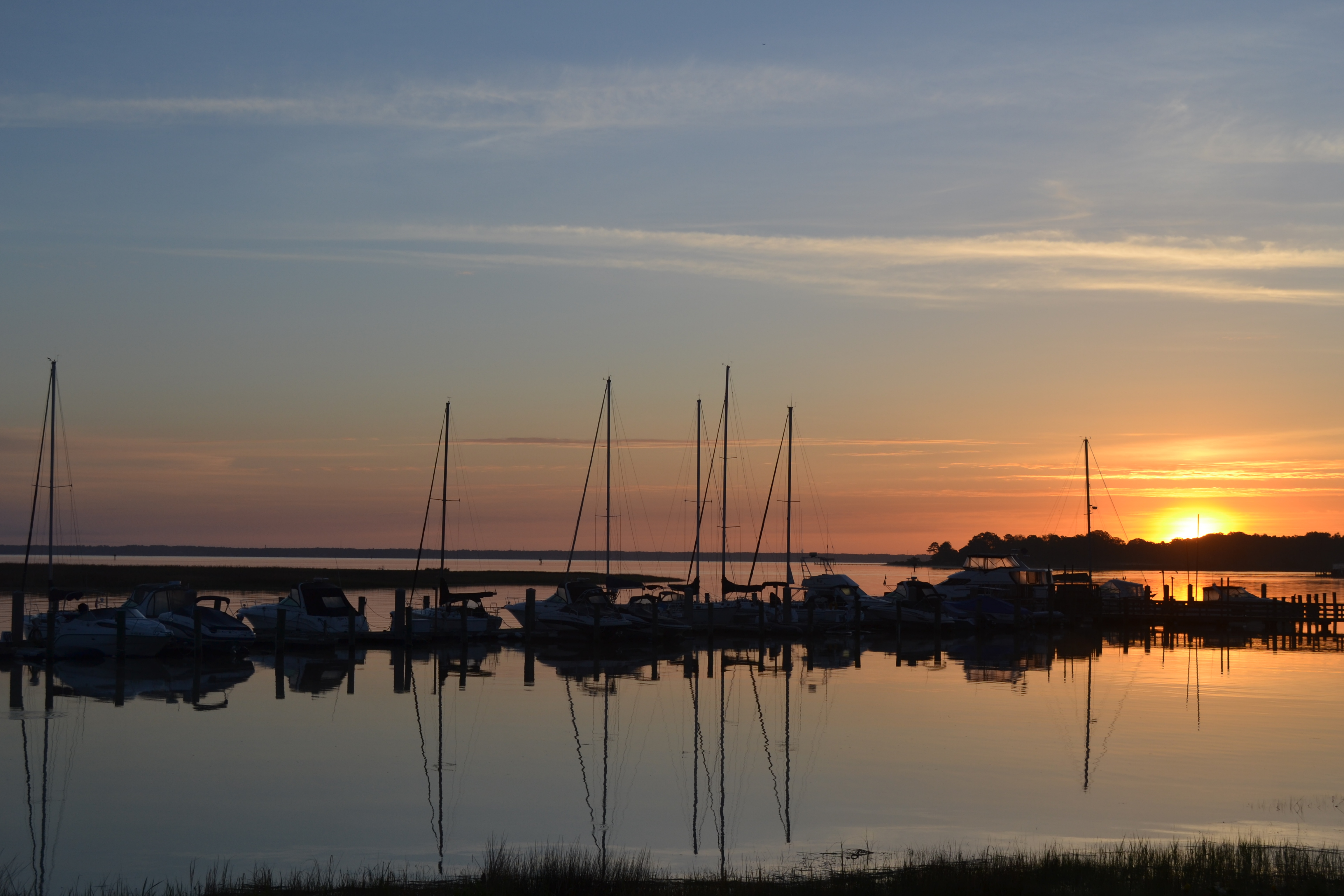 Looking at this photo, you see the mouth of the Pagan River (the body of water closer to the camera).  In the distance is the James River.  From our side of the water to the treeline on the opposite side, just to the left of the sunrise, the river is about four miles wide.