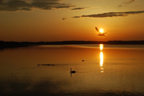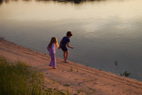 Our neighbors have a tiny patch of “beach” in front of their house. Their grandchildren were out feeding the swan, seagulls and ducks. And skimming rocks on the water. I love the reflection of the sunset on her hair.