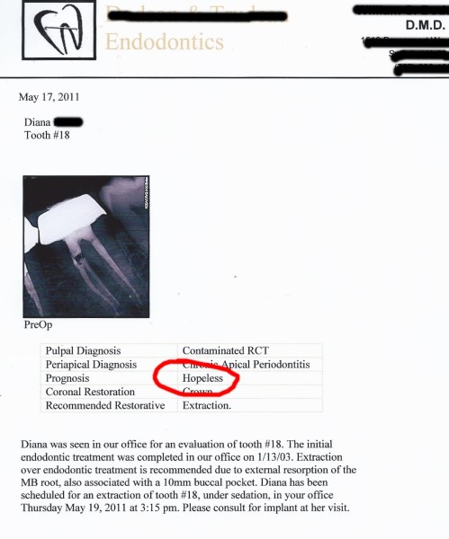 This tooth earned the “The Golden Tooth” award from me several years ago. It has a crown, plus a root canal done THROUGH the crown. The endodontist explained that when we lose a baby tooth, the roots are “absorbed” as the permanent tooth pushes upward.  Sometimes those little root “cells” remain dormant, and they can resurface years later to eat away at the permanent tooth. That’s what he suspects has happened in this case. So I think I’m more than ready for this tooth to be gone.