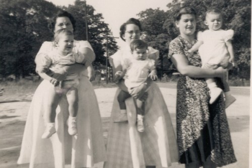 That’s my mom holding me on the left.  In the center is my aunt Betty holding her daughter, Christine, and my aunt Doris is on the right, holding her daughter, Lona.