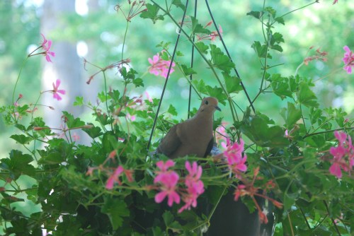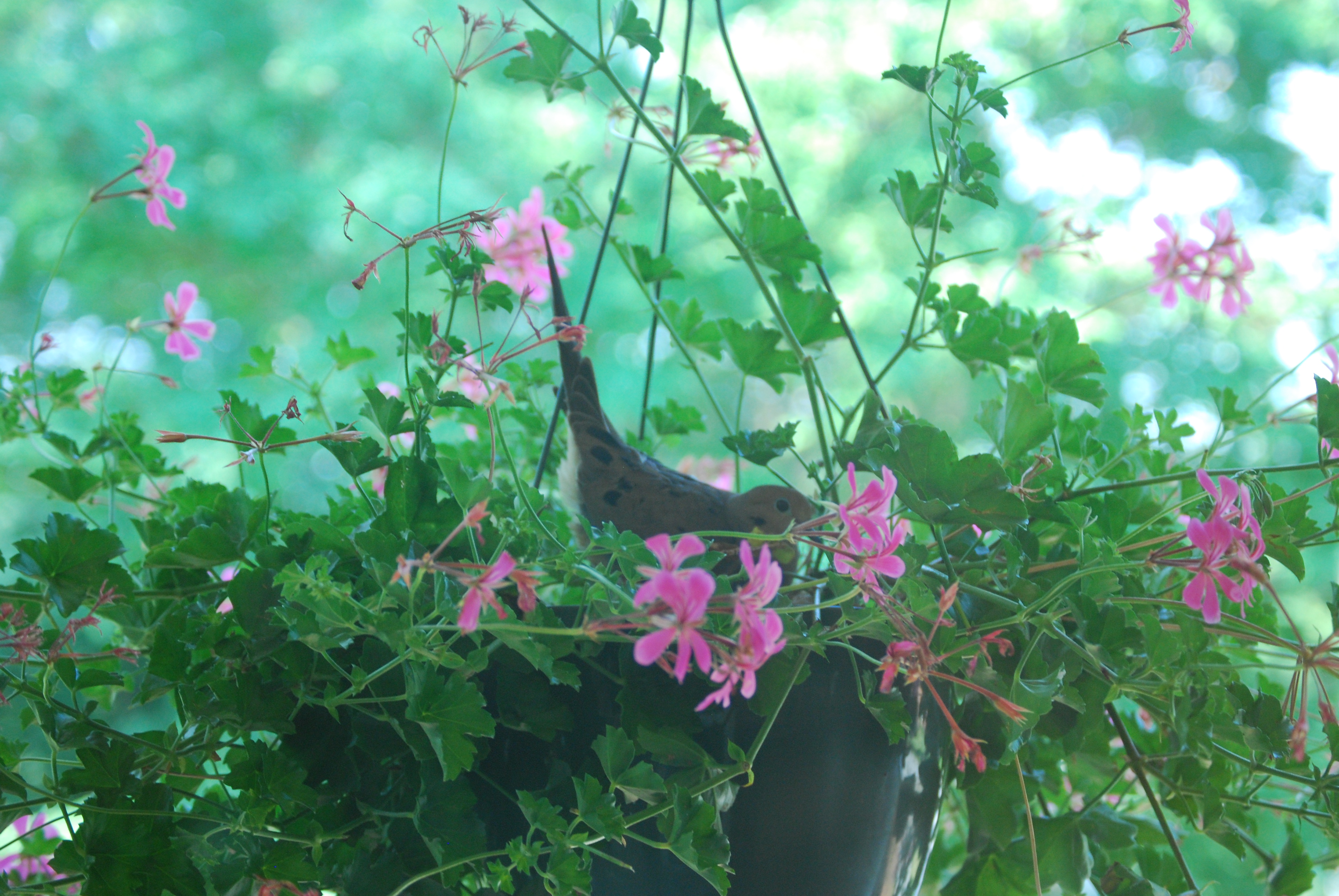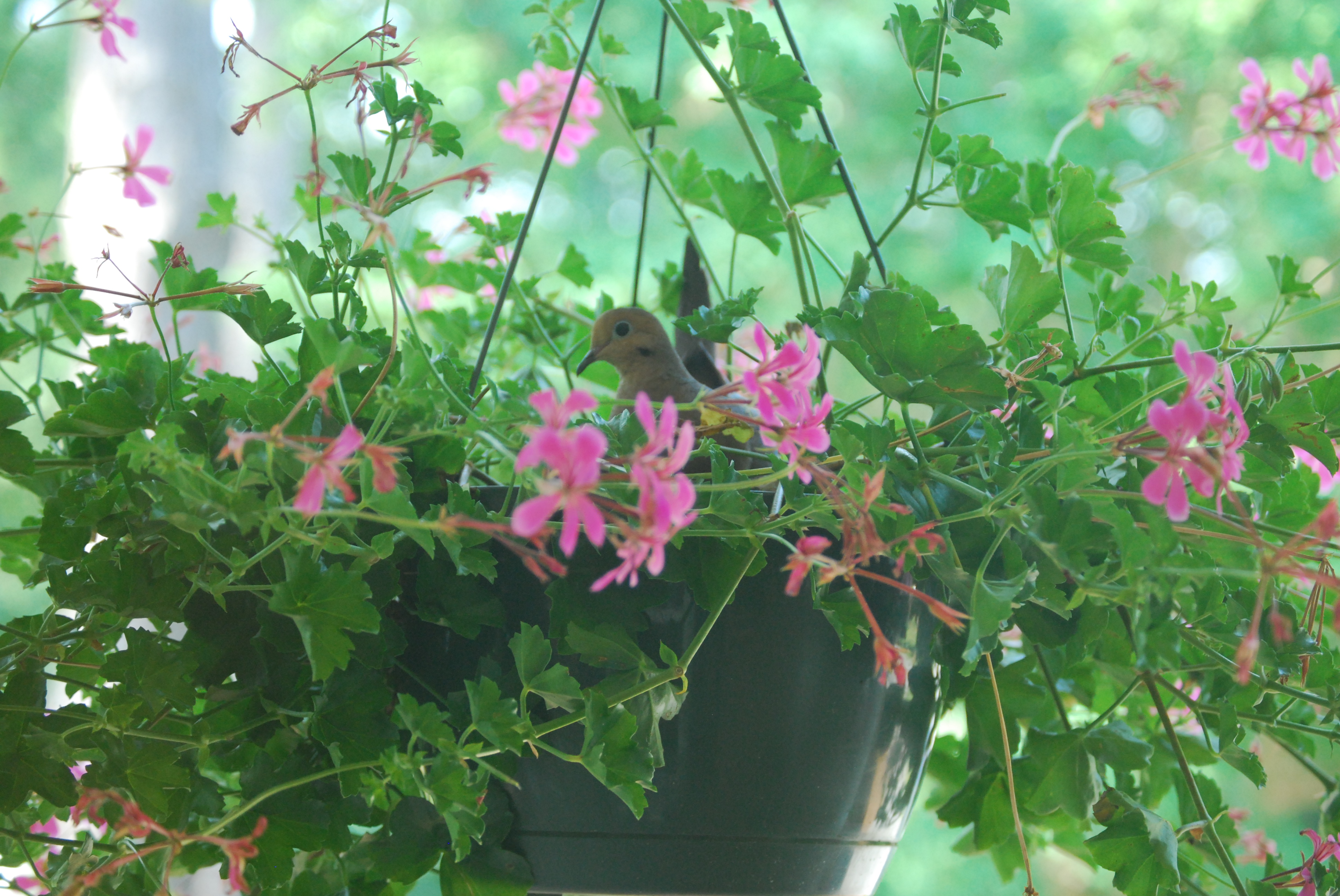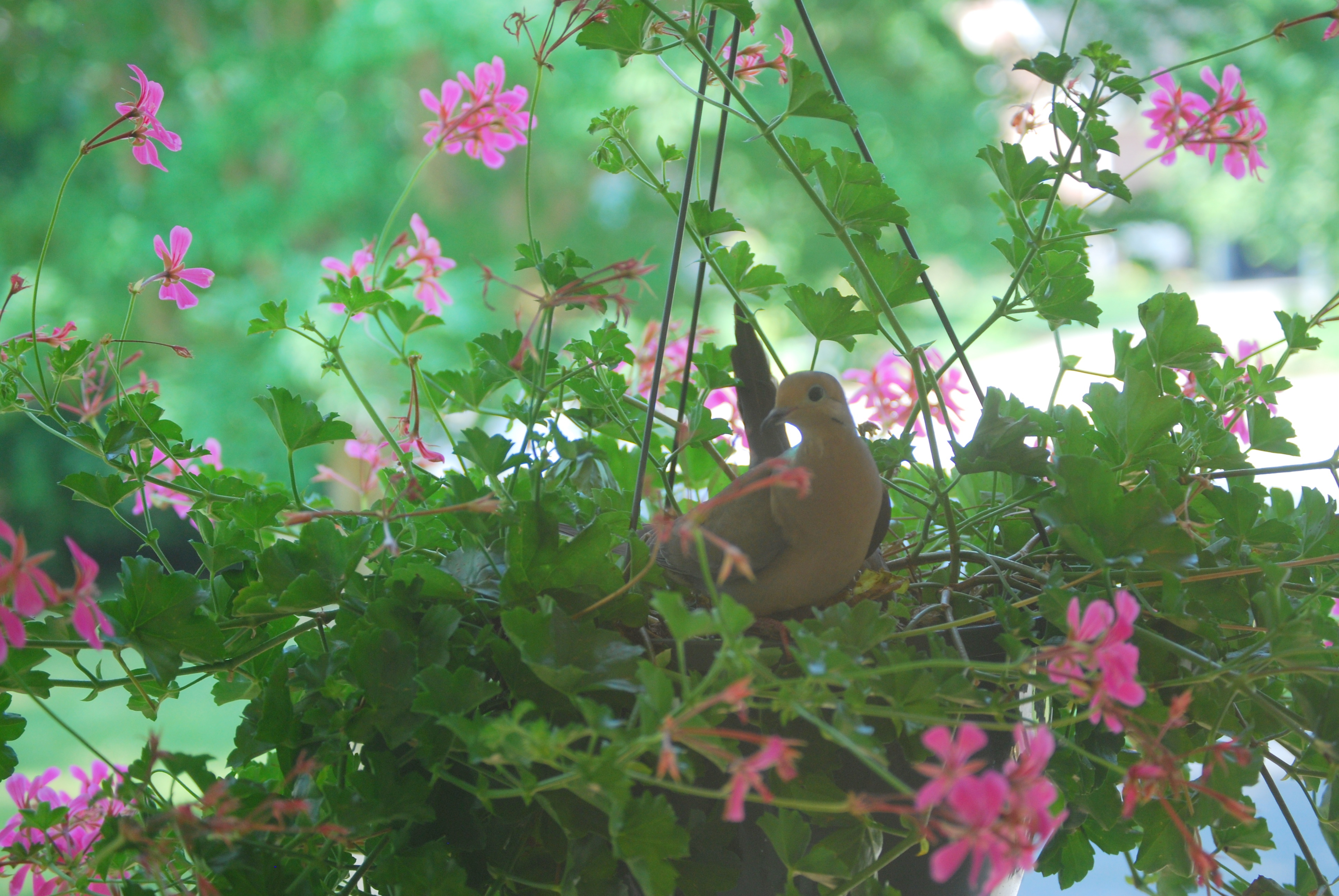 This will make watering the plant more difficult.  I’ll have to wait until both Mama and Daddy Dove are away from the nest to water. I’ll have to actually take the plant down when watering to be sure the nest doesn’t get wet. And I won’t be able to place the plant out on the ground when it rains.