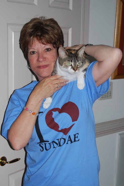 My sweet cousin, Lona, gave me this adorable shirt for my birthday.  “I (heart) Sundae” is printed on it. Do you know how difficult it is to hold a cat and show off the front of a shirt at the same time? I’d like to thank Sundae for not clawing my back during the making of this photo.