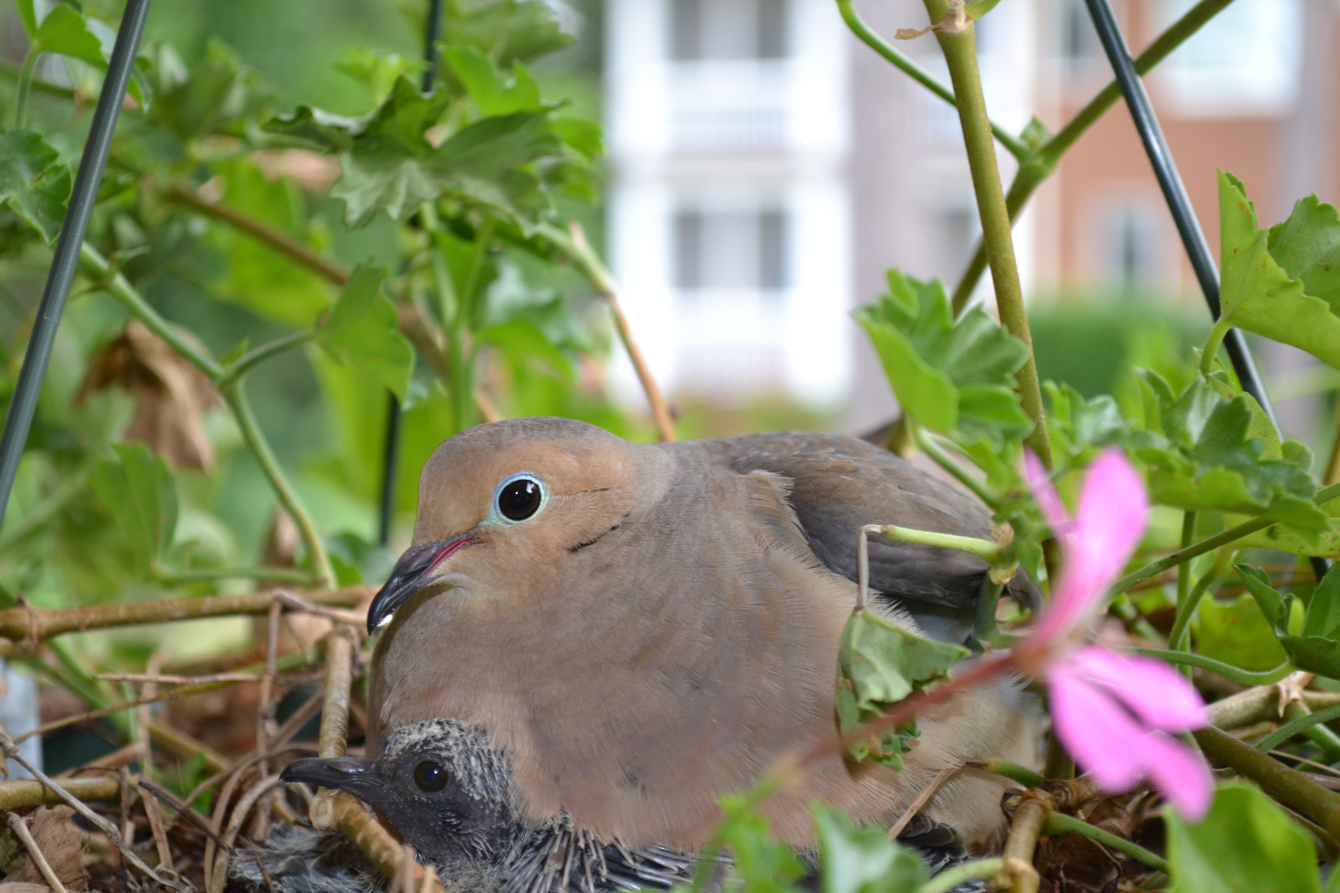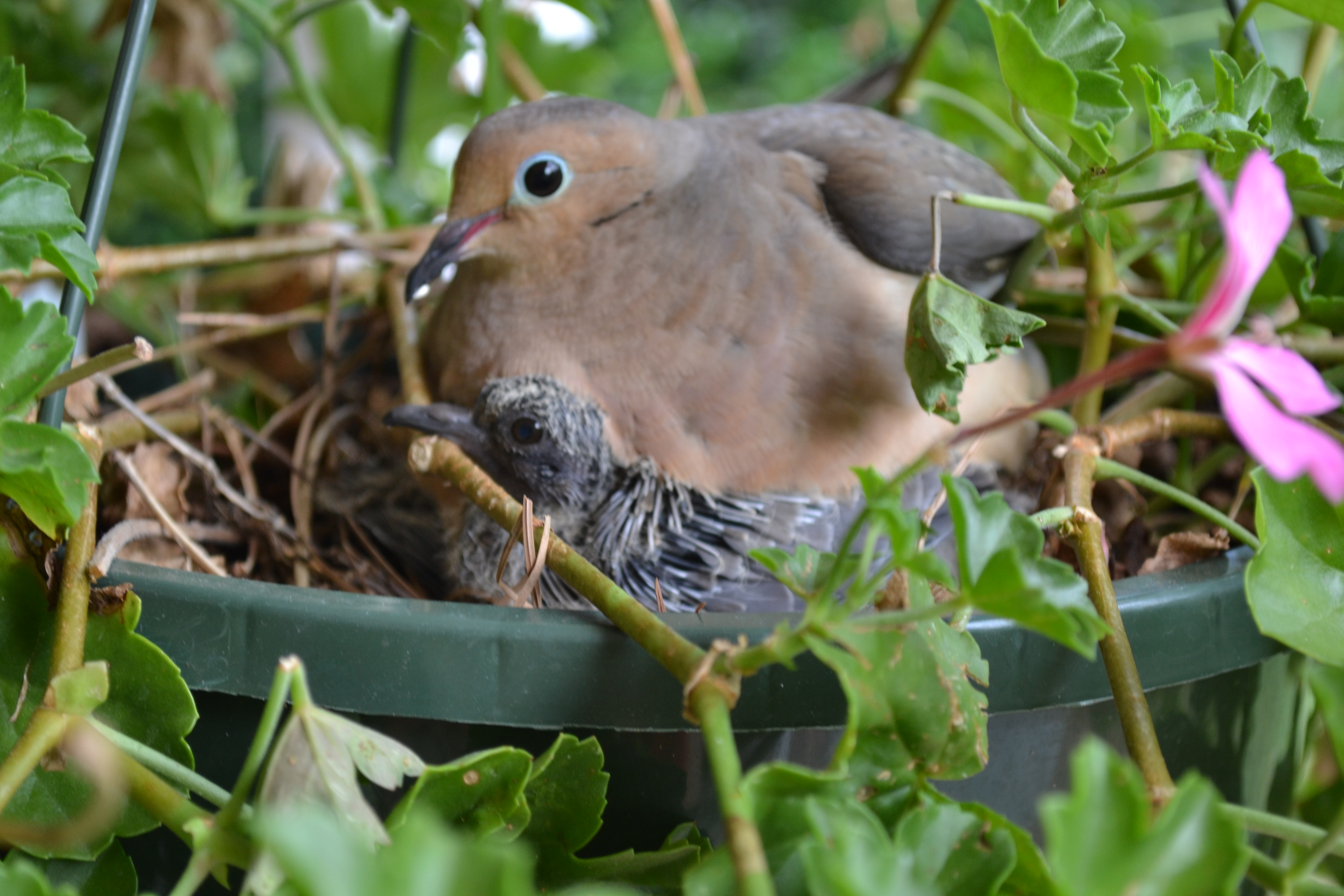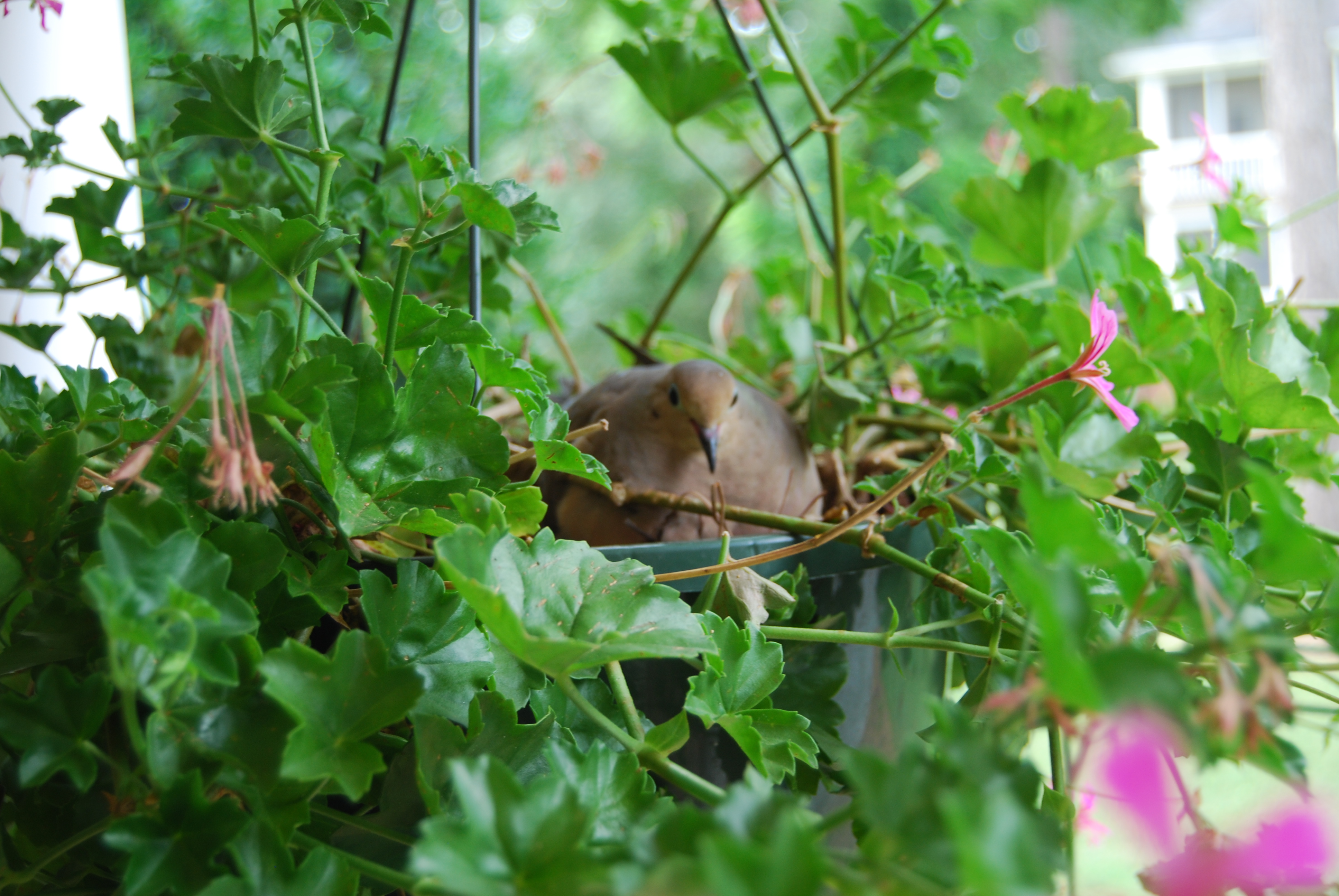 You may recall my post from earlier this month about a Mother Dove building a nest in my hanging geranium. If you missed it, here’s the link.
