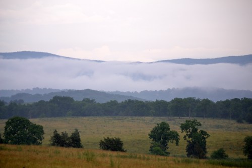 The day was overcast, and on our drive home, we noticed the clouds were below the mountaintops. I took this from my seat through Motor Man’s window. It’s amazing I didn’t get any signs, vehicles, or power lines in the picture.