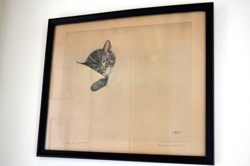 These were probably in a set of three, which would have included a picture of Chessie’s kittens, Nip and Tuck. The pictures are both 8 x 10’s, and I paid $10 for each of them. So far, I haven’t taken them anywhere to be appraised. The seal from the cabinet shop in Portsmouth, Virginia, where they were framed is on the back of each picture. The phone number shown for the shop is 2936-J.