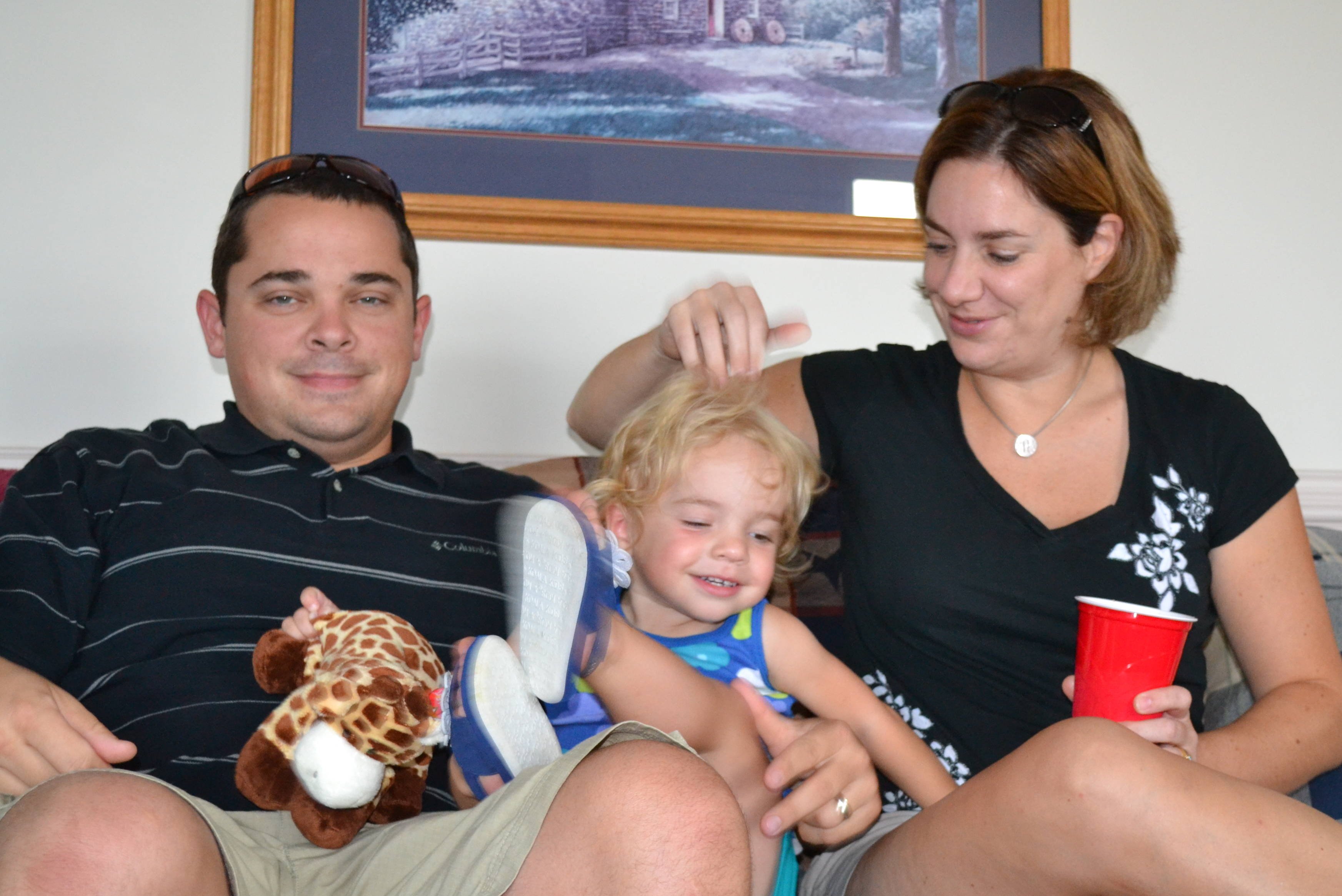 Motor Man and I gave Livy a Beanie Baby giraffe. She’s holding it in this picture. I had to snap the photo quickly, because a two-year old has places to go and things to do. And sitting still for a family picture isn’t high on that list.