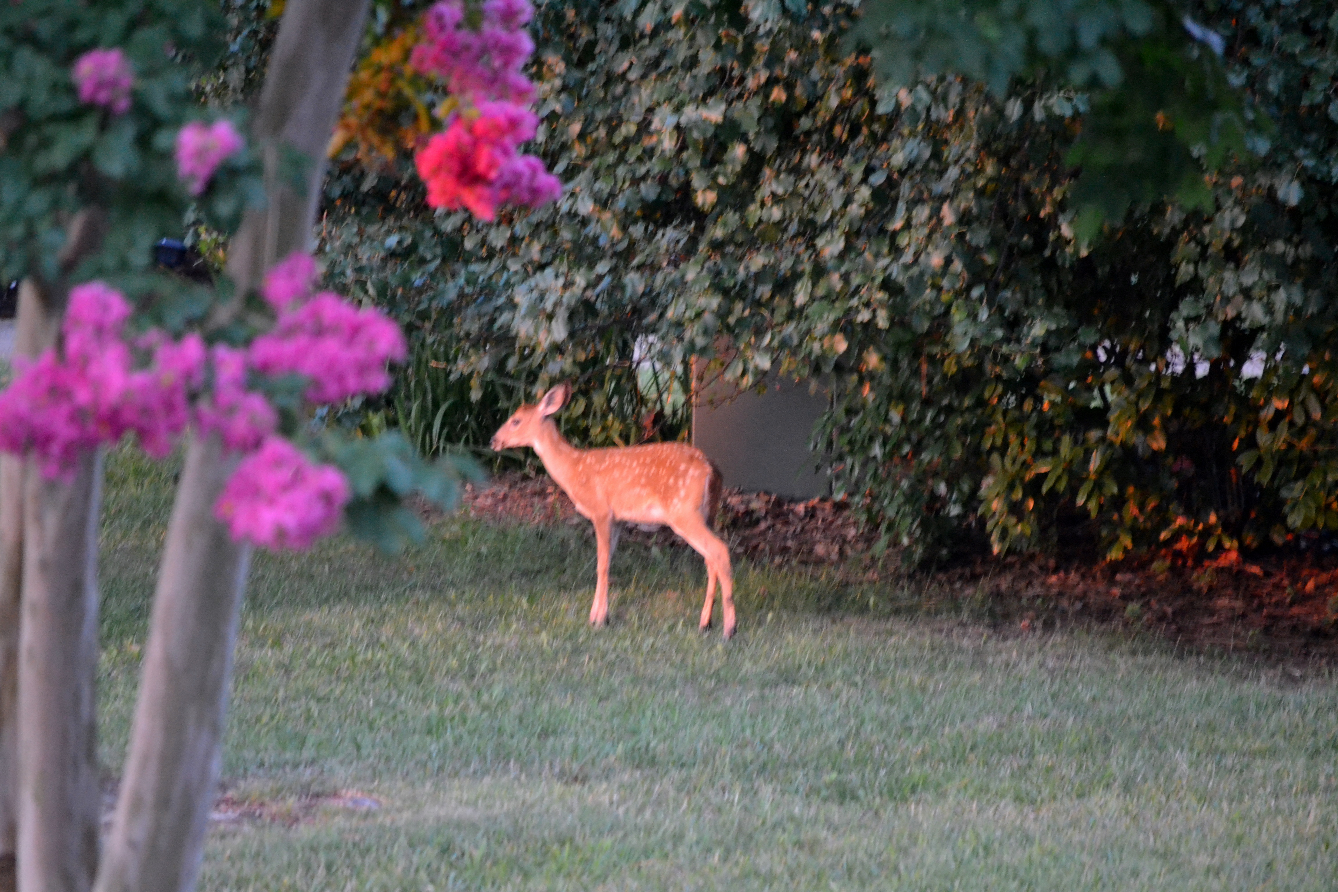 One morning last week, I opened our living room curtains and had to run for my camera. I apologize for the poor quality of this picture. I wish it were in better focus. But this fawn was so beautiful in the early morning light, I had to share.
