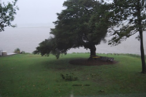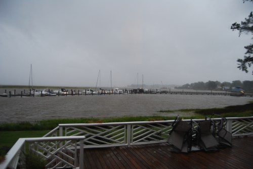Noon update: tide is rising, but not near our deck. Windows on the water side of the house are leaking, but we still have electricity!Oh – and the wind is howling!