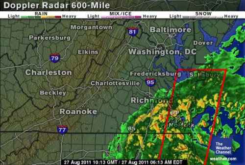 Irene is knocking on our door, and things are getting interesting. Here’s the radar image from just a few minutes ago; we’re just to the left of the “N” in Norfolk. Right about where that red watch-box line is.