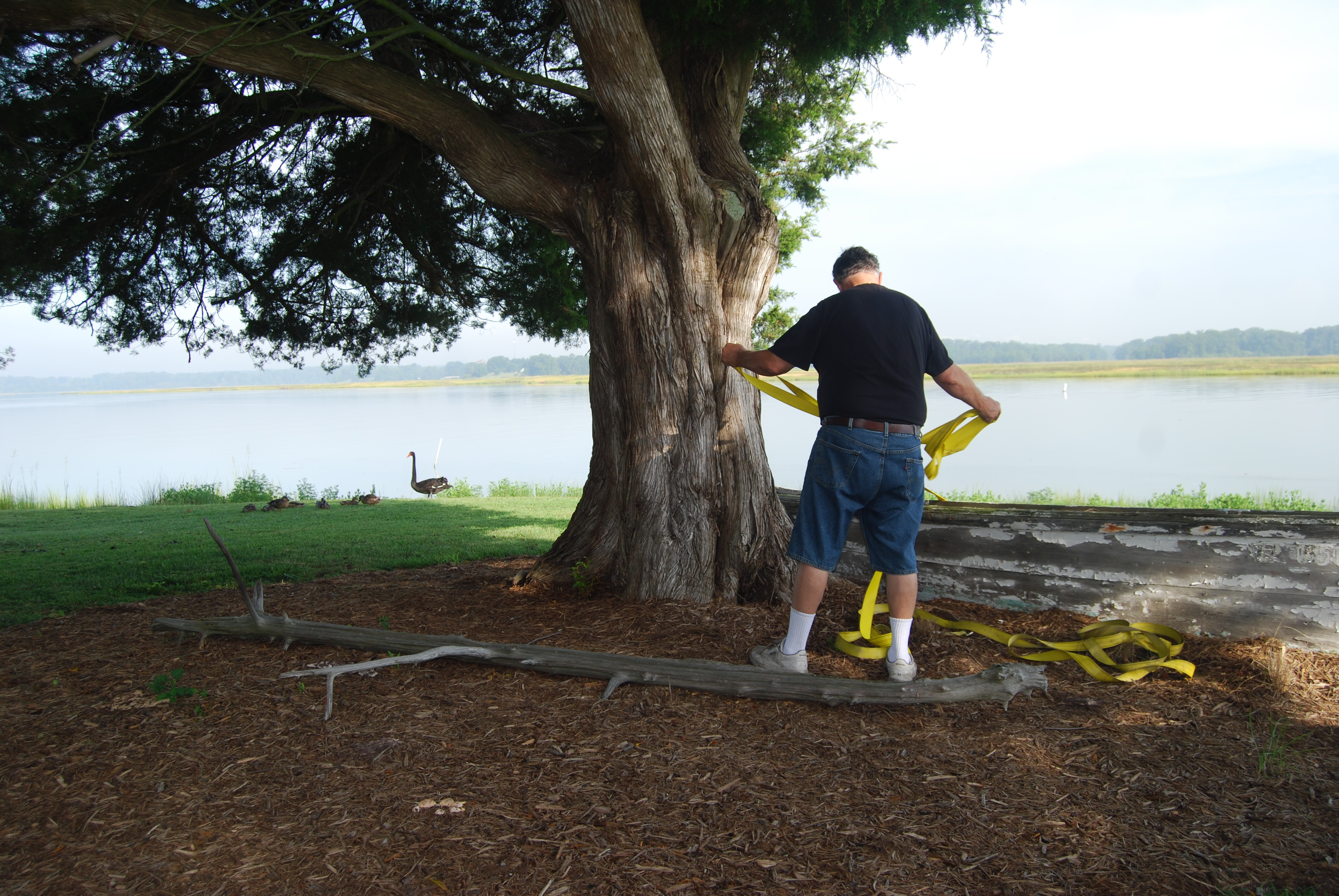 These pictures were taken the morning before Hurricane Irene. Motor Man was securing our old boat to the cedar tree in case of a severe high tide, which thankfully didn’t happen.