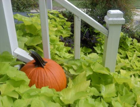 8. Love the photo….colors are wonderful but I agree with others who think that sweet potato vine is about to conquer the world! The pumpkin, however, looks PERFECT!