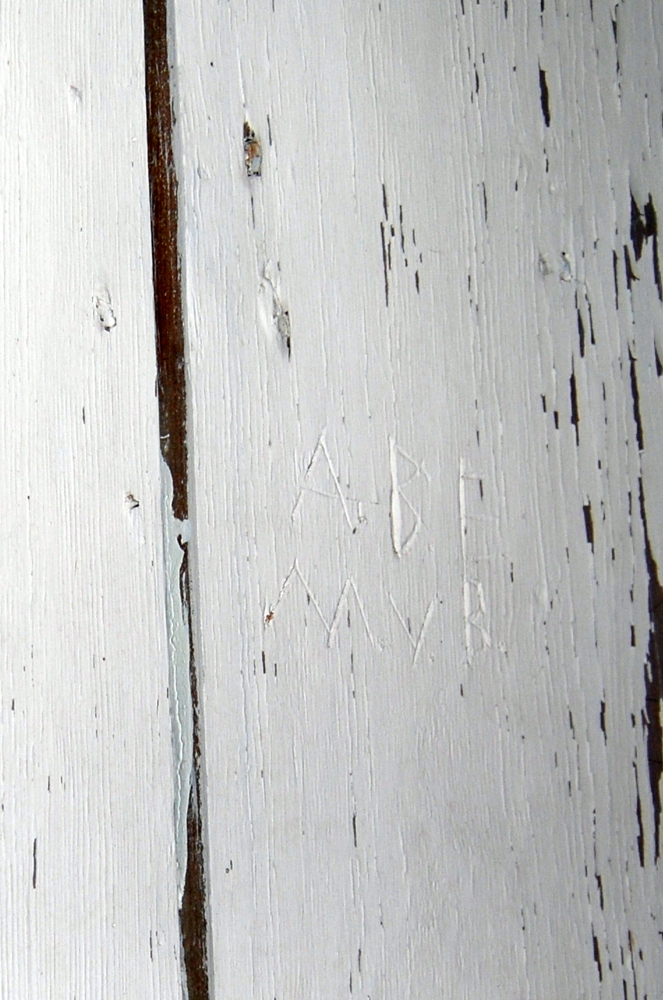 This is the back side of one of the doors located in the attic at Bacon’s Castle. Once again, we find Andrew’s initials. These carvings must have taken place after the ones in the previous picture, because MVB became his wife.