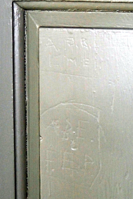 If you look closely on the facing of the window to the left, you’ll see evidence of my family’s years at the Castle. Remember I mentioned my Aunt Lucille in yesterday’s post? The initials in the top left corner in this next picture are those of her (future) husband, AGB, followed by hers: LME. They’ve been painted over many, many times, but are still visible.