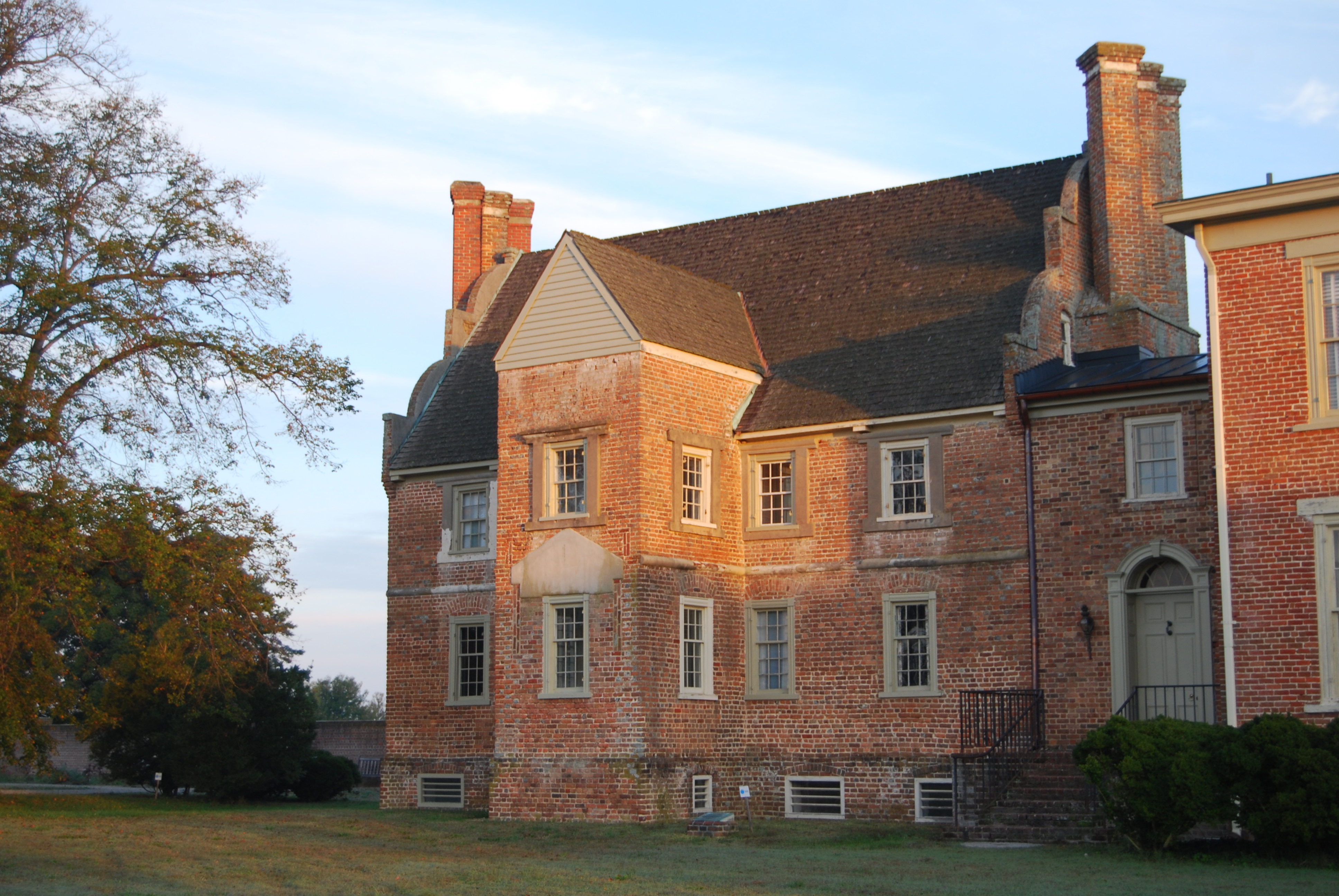 When Bacon’s Castle was built, the front door was in the area of the house that’s illuminated in the morning light in this next picture. It was known as the porch tower. Sometime in the 1700’s, an addition was built and joined to the original house by way of a “hyphen”. The front door was then moved to the hyphen.