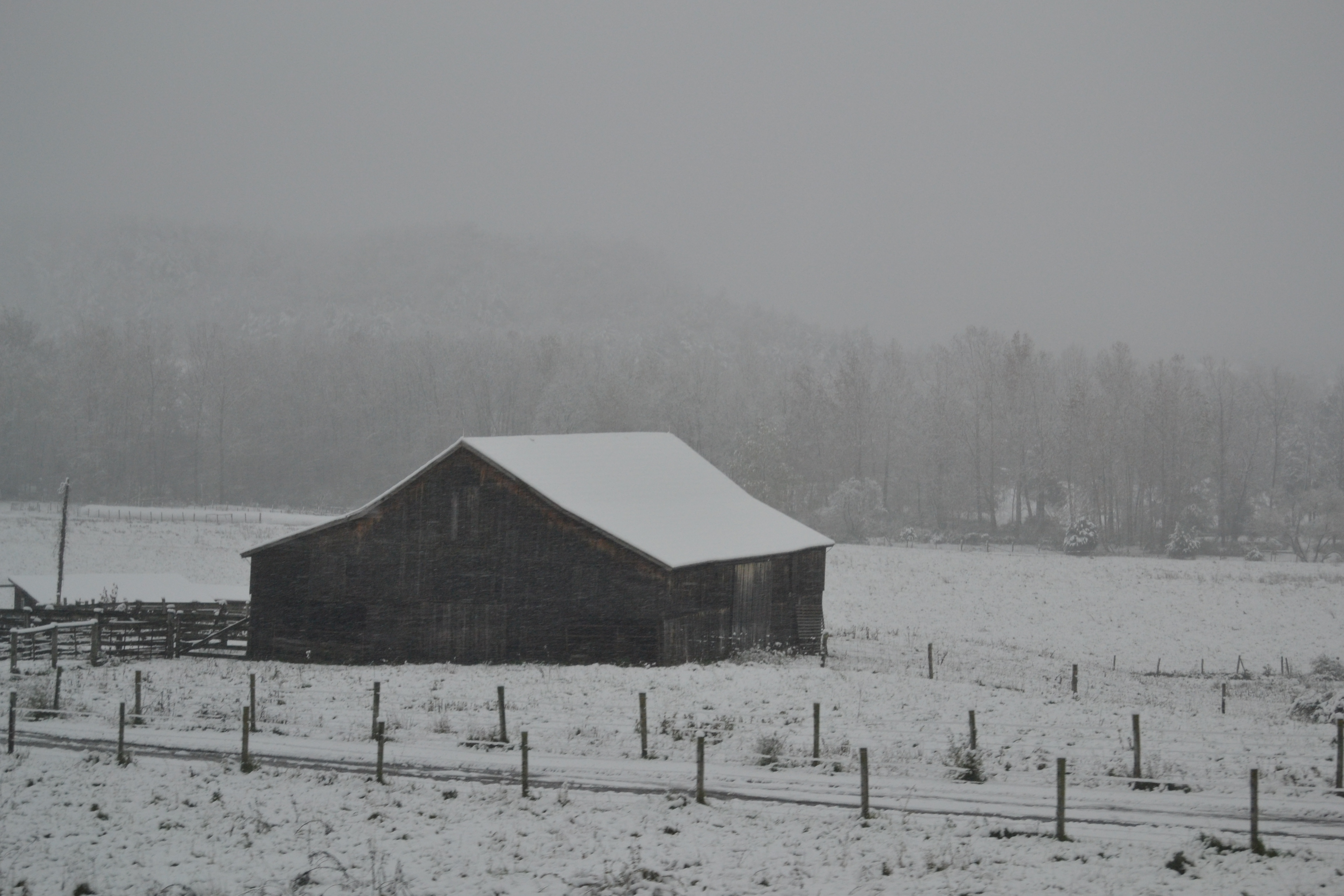 This first barn was somewhere near the Harrisonburg area of Virginia. It was snowing heavily there as we passed through on Saturday morning. I love the little fence-lined lane (road?) beside the barn.