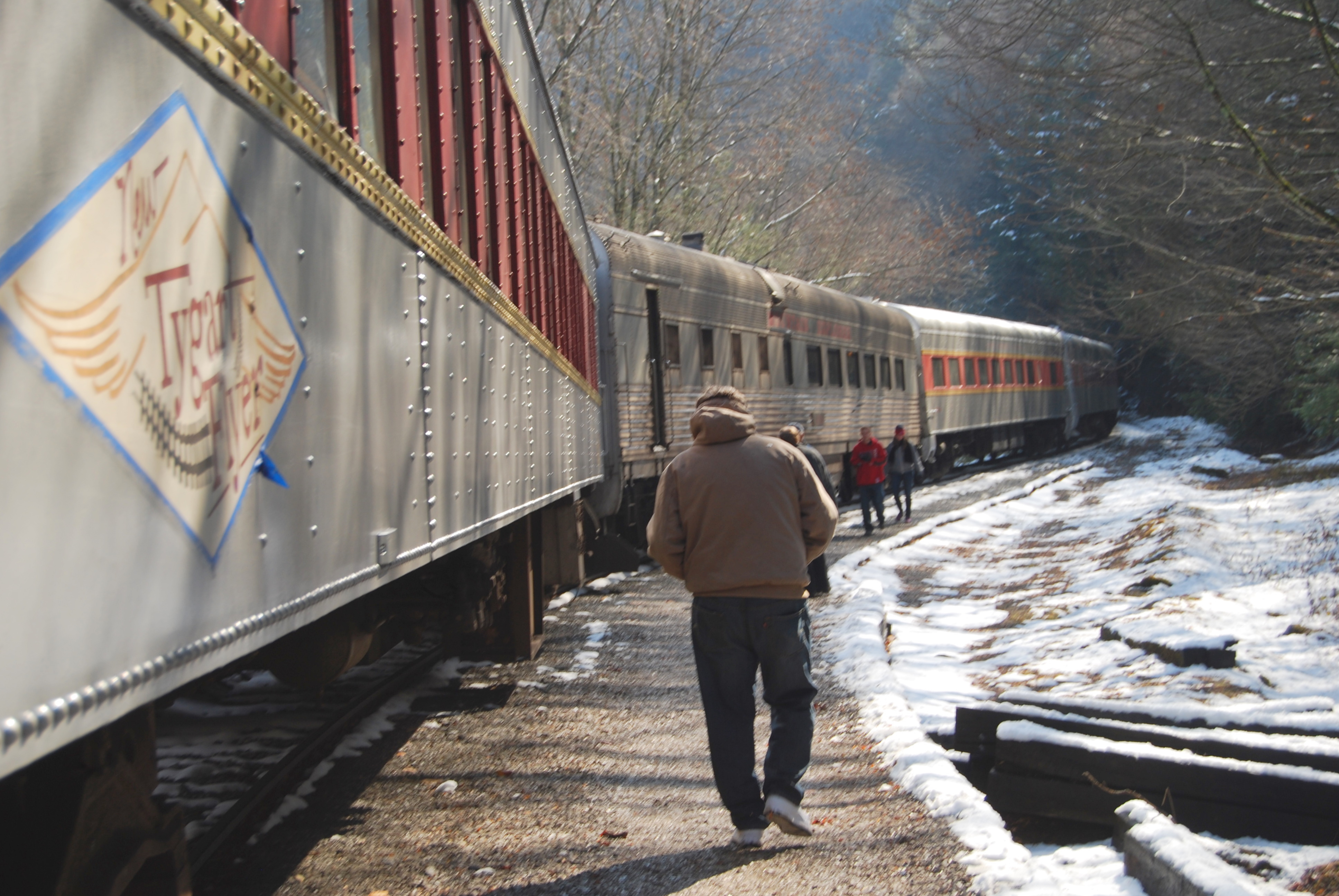 The car we were in for this ride was toward the back of the train. There’s a bit of everything in this next picture: the cars at the front of the train rounding a curve, a little snow, a little fall foliage, a river and West Virginia mountains in the background.