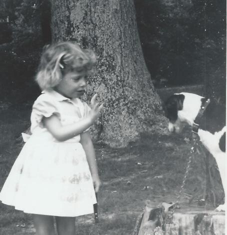 This is my niece, Donna. The dog, named Frances, belonged to our aunt and uncle, and the photo was taken at their house. After studying the picture for awhile, I noticed a couple of things that weren’t apparent right away. The handle of the leash is barely visible in Donna’s left hand. I can imagine her walking Frances around the yard, and deciding that this tree stump would be a good place to stop.