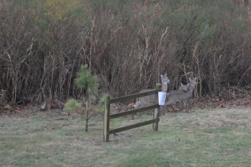 A short time later, I happened to look out of a window at the other end of the house, and saw not only the two fawns, but also Mama Deer. I apologize for the poor quality, but it was such a cute picture, I wanted to share. Hopefully, you can click it to enlarge.