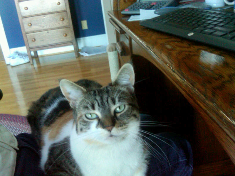 3). I resolve to be more of a lap kitty. I’ve already been working on that one. Motor Mommy took this picture yesterday of me on her lap while she was sitting at her desk. (Pardon Motor Man’s shoes in the background, as well as my plastic bag.) Motor Mommy  snapped this with her cell phone, and doesn’t think it’s a very good picture. But I’m in it, so I ask you: how bad can it be?