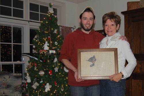 Later in the day, Marshall visited, and we exchanged gifts. Before he was born, I stitched this “Chessie” picture for his nursery. It had been stored away at his house for many years, but he searched the attic, found it and gave it to me for Christmas.
