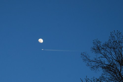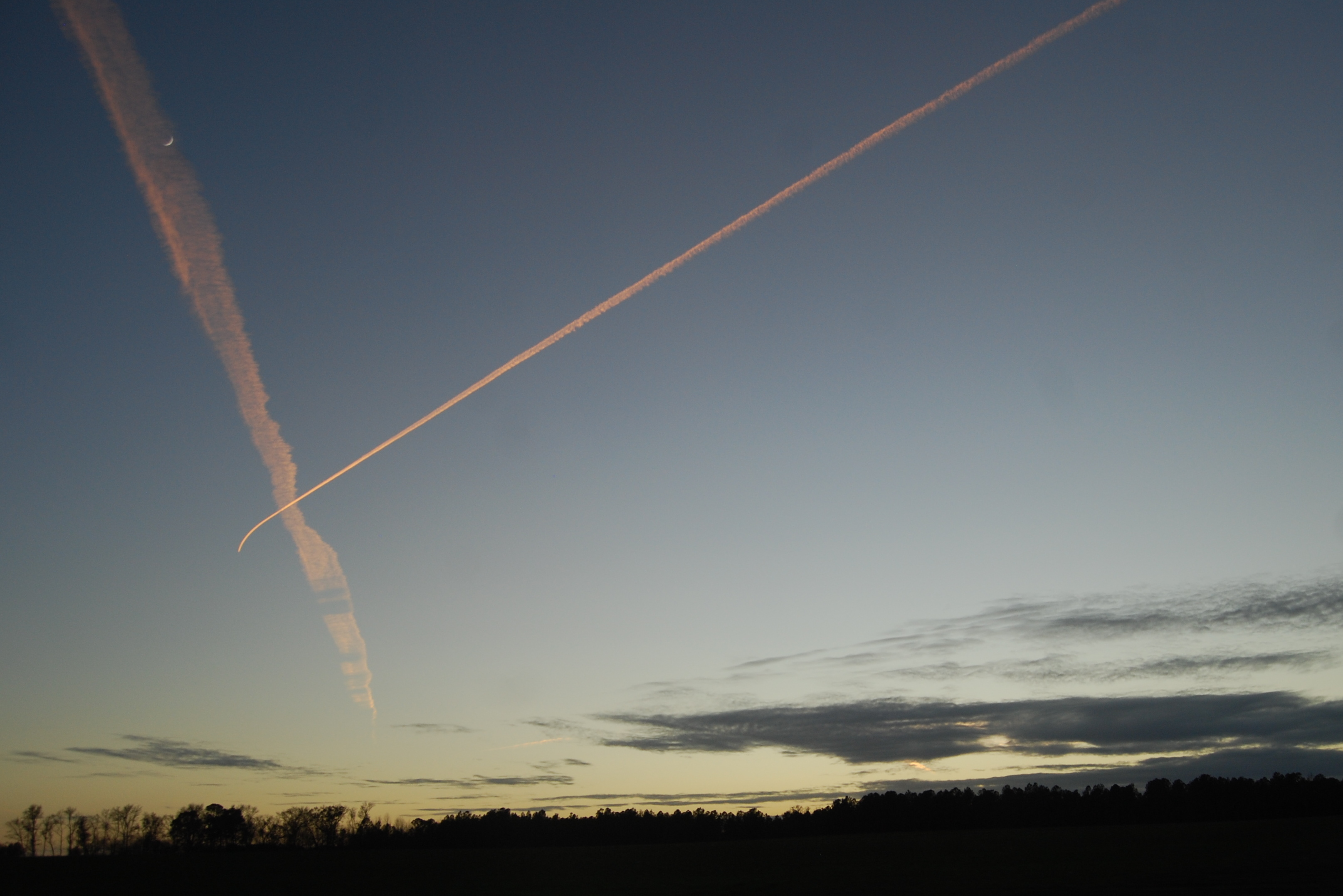 I took this next picture because of the interesting contrails. But look closely in the top left corner. (You may need to click to enlarge the picture.) I didn’t realize it was there until the photos were downloaded to the computer. A nice surprise, I thought.