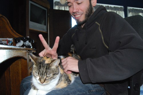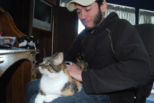 However, in spite of herself, she’s learning that a human’s lap is not the worst place to be. Case in point: last week, Marshall came to our house to back up my computer files. As soon as he sat down at the computer, he had company.