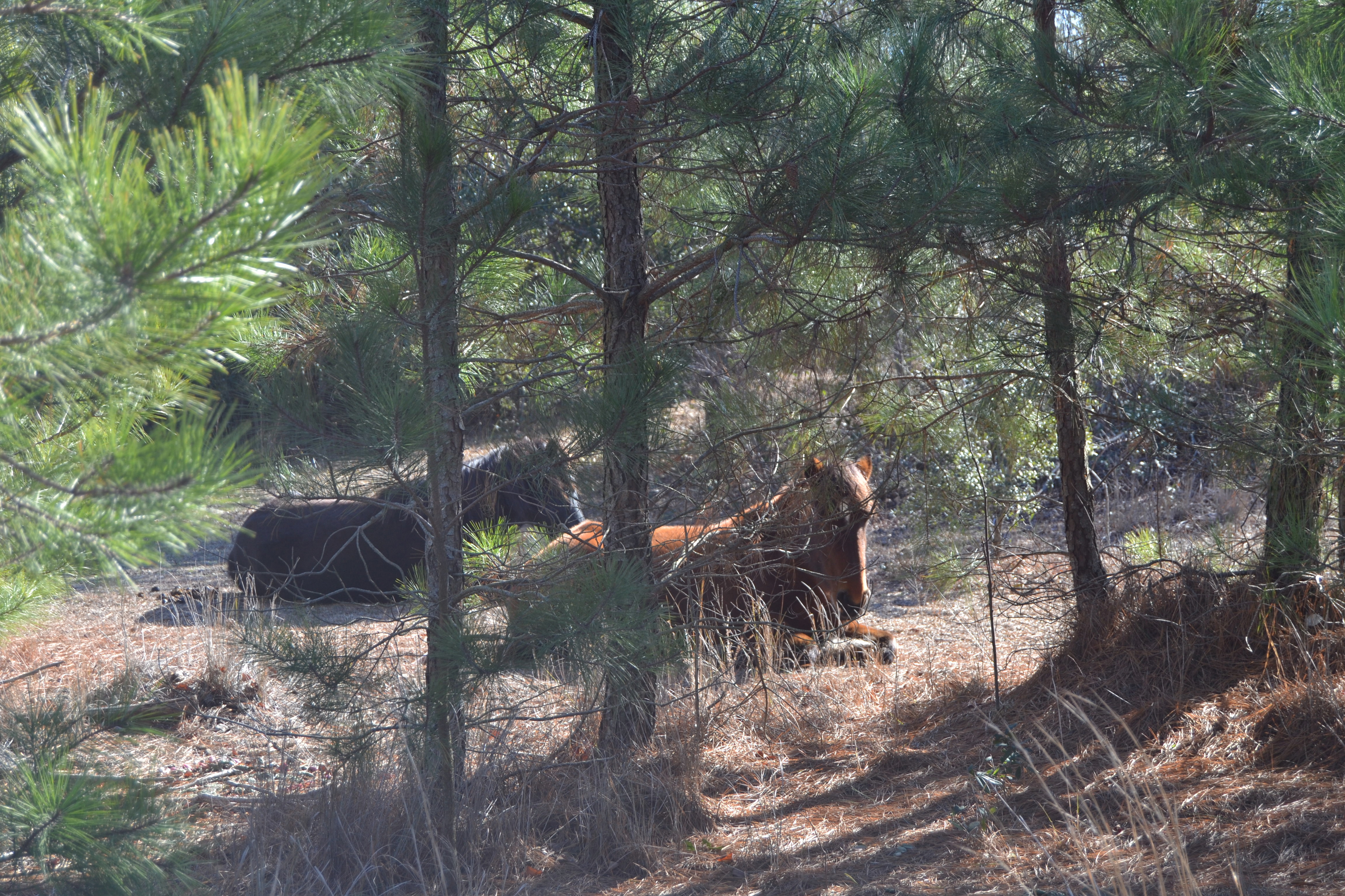 We ventured inland off the beach, each of us keeping an eye out for the horses. Bev caught glimpse of these two, bedded down, staying warm in the morning sun.