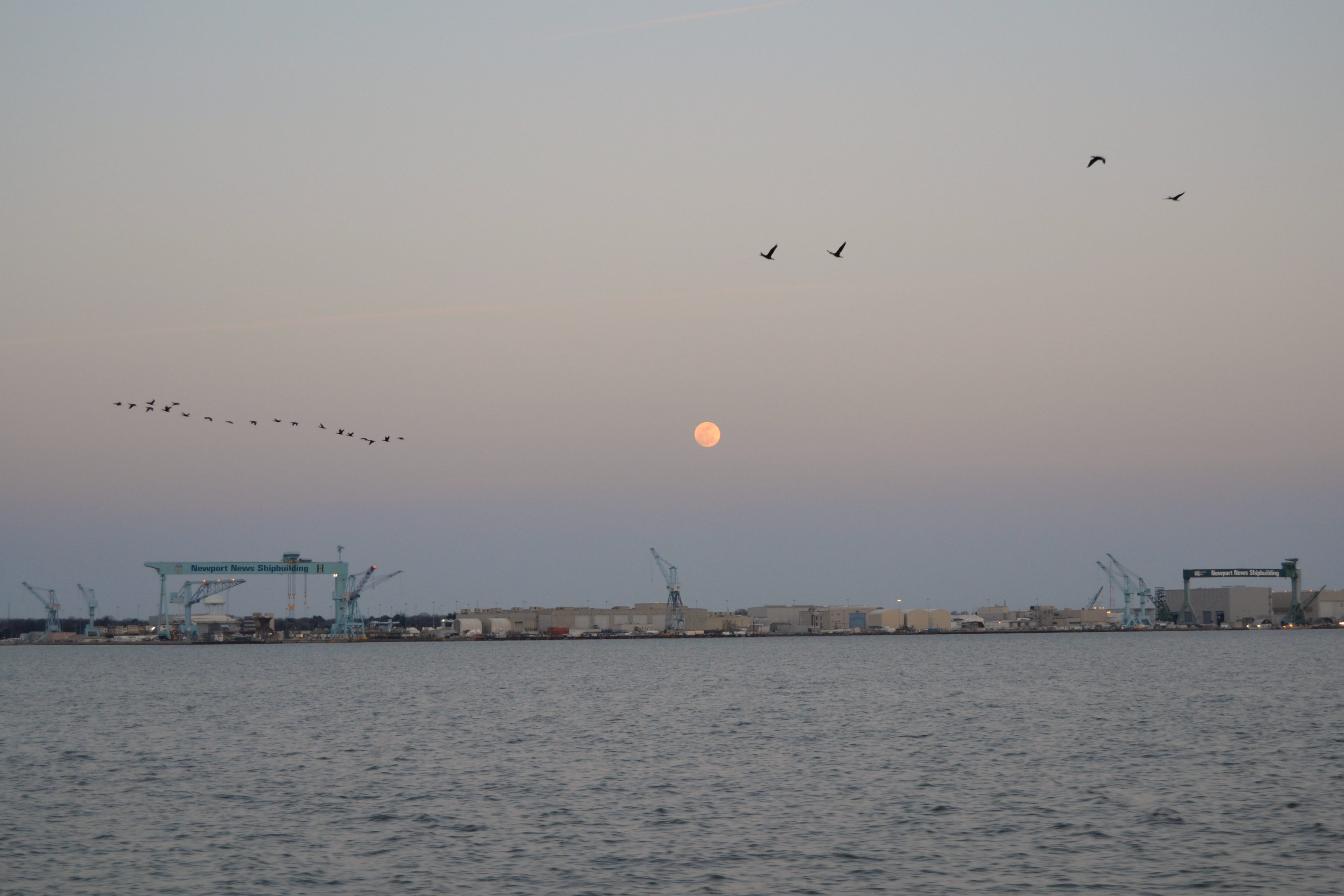Motor Man and I were, once again, running an errand in Newport News, and I took this picture of the moonrise as we were crossing the James River Bridge. That’s Newport News Shipbuilding in the distance.