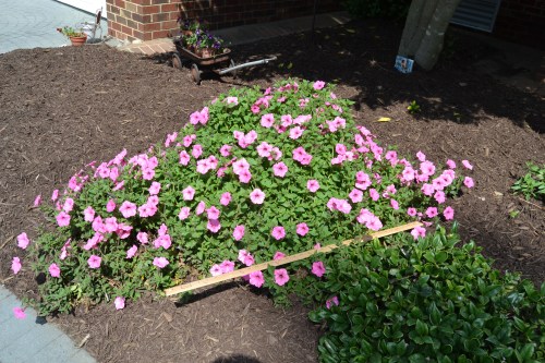 But I was hopeful, and came home and plopped it in the ground. It did well the remainder of the season, and to my surprise, returned the following spring. This picture was taken in September of 2009, when my friend’s daughter was married in our yard. See that pink “petunia” just to the right of the bride?