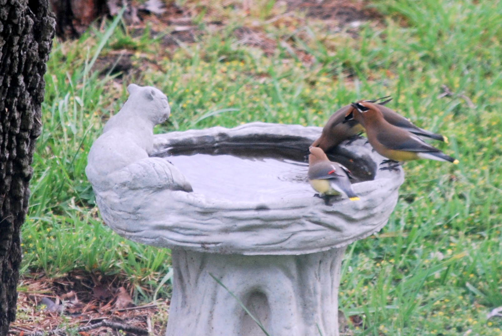 The birdbath was a flurry of activity, with yellow-tipped tailfeathers everywhere.