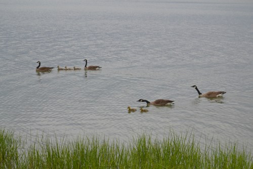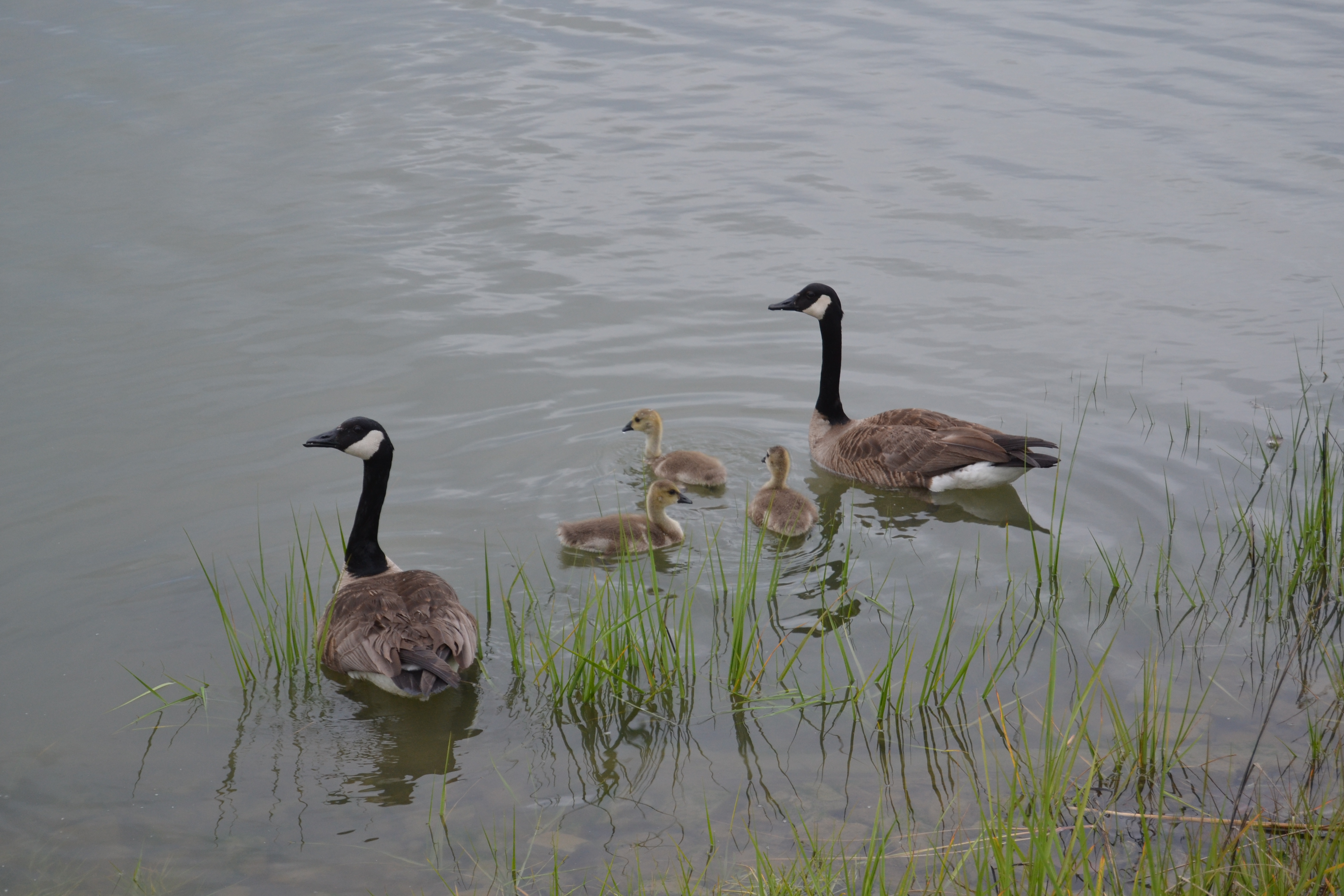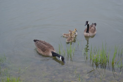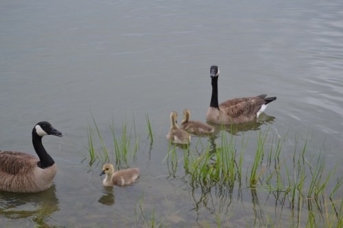 One family has three children. Those are a bit older than the two little ones in the other family. The goslings are so cute and awkward when they scamper around.
