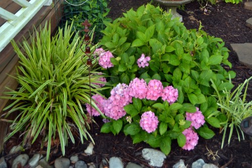 Marshall gave me this hydrangea a few years ago. When he gave it to me, the blooms were blue, but because of our soil, they’re now pink. (My sweet mother called hydrangeas “high geraniums”.) The deer have enjoyed some of the leaves (top right), but left the blooms for me to enjoy.