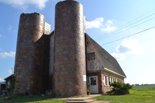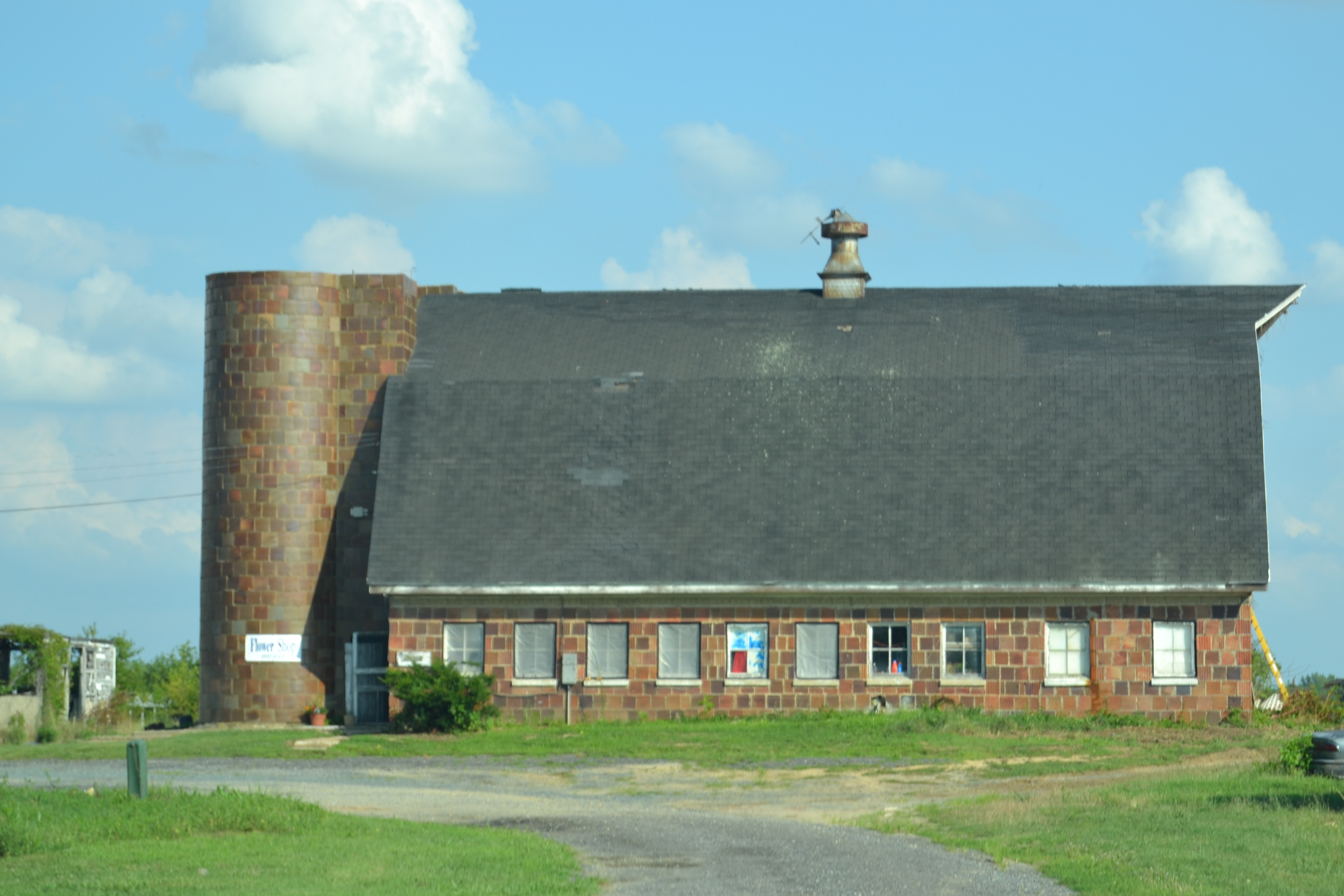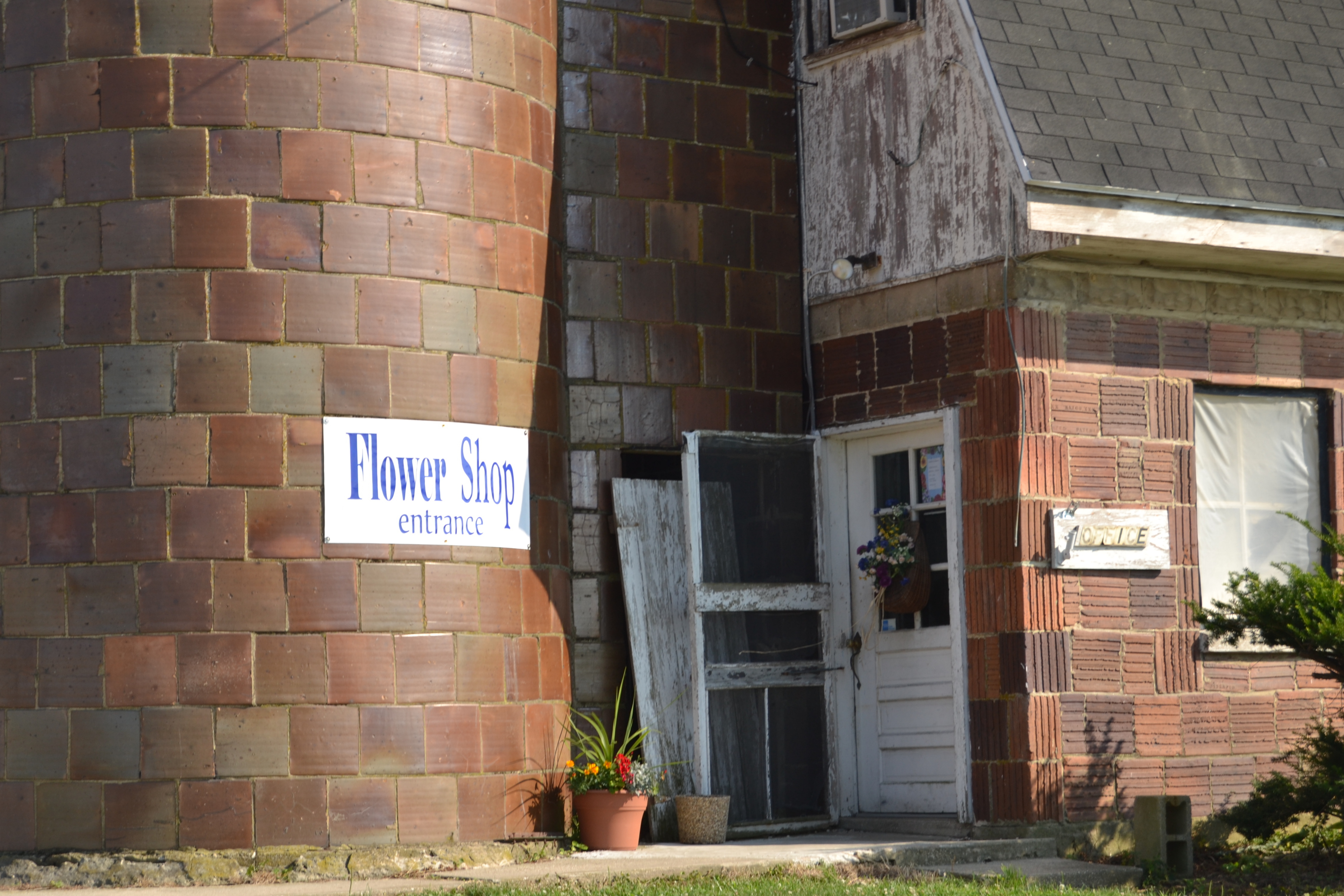 Definitely a different type of construction material and quite a large barn AND silos. Don’t often see TWO silos. Wonder what the flower shop is like inside??